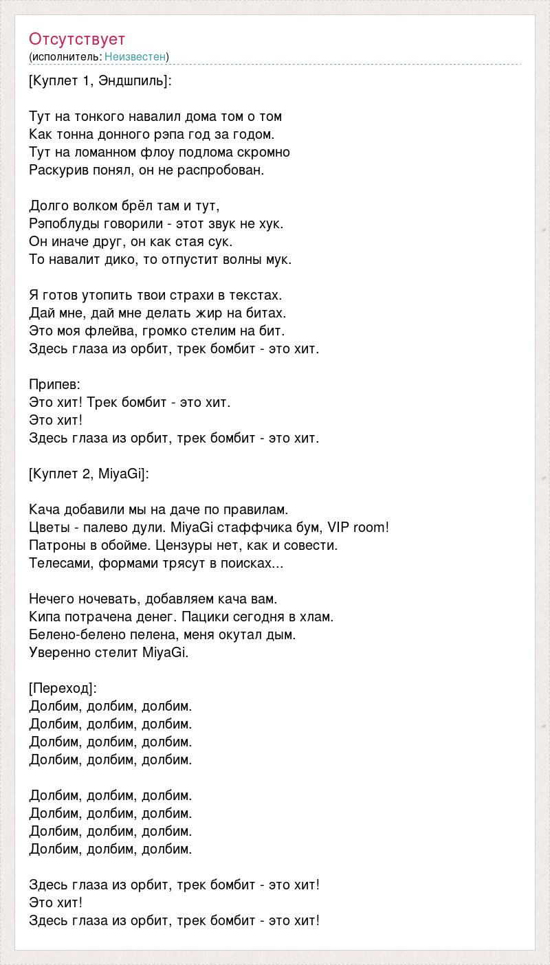 [Куплет 1, Эндшпиль]: Тут на тонкого навалил дома том о том Как тонна донного рэпа год за годом. Тут на ломанном флоу подлома скромно Раскурив понял, он не распробован. Долго волком брёл там и тут, Рэпоблуды говорили - этот звук не хук. Он иначе друг, он как стая сук. То навалит дико, то отпустит волны мук. Я готов утопить твои страхи в текстах. Дай мне, дай мне делать жир на битах. Это моя флейва, громко стелим на бит. Здесь глаза из орбит, трек бомбит - это хит. Припев: Это хит! Трек бомбит - это хит. Это хит! Здесь глаза из орбит, трек бомбит - это хит. [Куплет 2, MiyaGi]: Кача добавили мы на даче по правилам. Цветы - палево дули. MiyaGi стаффчика бум, VIP room! Патроны в обойме. Цензуры нет, как и совести. Телесами, формами трясут в поисках... Нечего ночевать, добавляем кача вам. Кипа потрачена денег. Пацики сегодня в хлам. Белено-белено пелена, меня окутал дым. Уверенно стелит MiyaGi. [Переход]: Долбим, долбим, долбим. Долбим, долбим, долбим. Долбим, долбим, долбим. Долбим, долбим, долбим. Долбим, долбим, долбим. Долбим, долбим, долбим. Долбим, долбим, долбим. Долбим, долбим, долбим. Здесь глаза из орбит, трек бомбит - это хит! Это хит! Здесь глаза из орбит, трек бомбит - это хит!