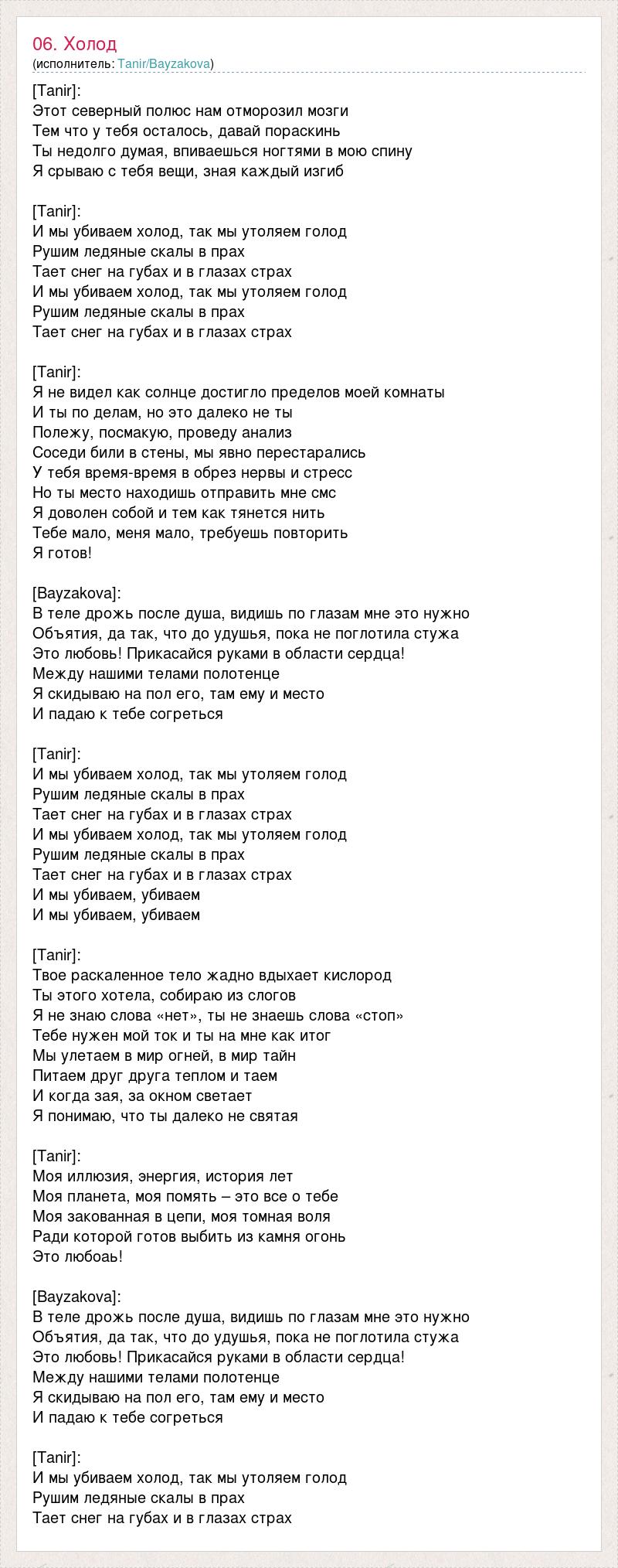 [Tanir]: Этот северный полюс нам отморозил мозги Тем что у тебя осталось, давай пораскинь Ты недолго думая, впиваешься ногтями в мою спину Я срываю с тебя вещи, зная каждый изгиб [Tanir]: И мы убиваем холод, так мы утоляем голод Рушим ледяные скалы в прах Тает снег на губах и в глазах страх И мы убиваем холод, так мы утоляем голод Рушим ледяные скалы в прах Тает снег на губах и в глазах страх [Tanir]: Я не видел как солнце достигло пределов моей комнаты И ты по делам, но это далеко не ты Полежу, посмакую, проведу анализ Соседи били в стены, мы явно перестарались У тебя время-время в обрез нервы и стресс Но ты место находишь отправить мне смс Я доволен собой и тем как тянется нить Тебе мало, меня мало, требуешь повторить Я готов! [Bayzakova]: В теле дрожь после душа, видишь по глазам мне это нужно Объятия, да так, что до удушья, пока не поглотила стужа Это любовь! Прикасайся руками в области сердца! Между нашими телами полотенце Я скидываю на пол его, там ему и место И падаю к тебе согреться [Tanir]: И мы убиваем холод, так мы утоляем голод Рушим ледяные скалы в прах Тает снег на губах и в глазах страх И мы убиваем холод, так мы утоляем голод Рушим ледяные скалы в прах Тает снег на губах и в глазах страх И мы убиваем, убиваем И мы убиваем, убиваем [Tanir]: Твое раскаленное тело жадно вдыхает кислород Ты этого хотела, собираю из слогов Я не знаю слова «нет», ты не знаешь слова «стоп» Тебе нужен мой ток и ты на мне как итог Мы улетаем в мир огней, в мир тайн Питаем друг друга теплом и таем И когда зая, за окном светает Я понимаю, что ты далеко не святая [Tanir]: Моя иллюзия, энергия, история лет Моя планета, моя помять – это все о тебе Моя закованная в цепи, моя томная воля Ради которой готов выбить из камня огонь Это любоаь! [Bayzakova]: В теле дрожь после душа, видишь по глазам мне это нужно Объятия, да так, что до удушья, пока не поглотила стужа Это любовь! Прикасайся руками в области сердца! Между нашими телами полотенце Я скидываю на пол его, там ему и место И падаю к тебе согреться [Tanir]: И мы убиваем холод, так мы утоляем голод Рушим ледяные скалы в прах Тает снег на губах и в глазах страх