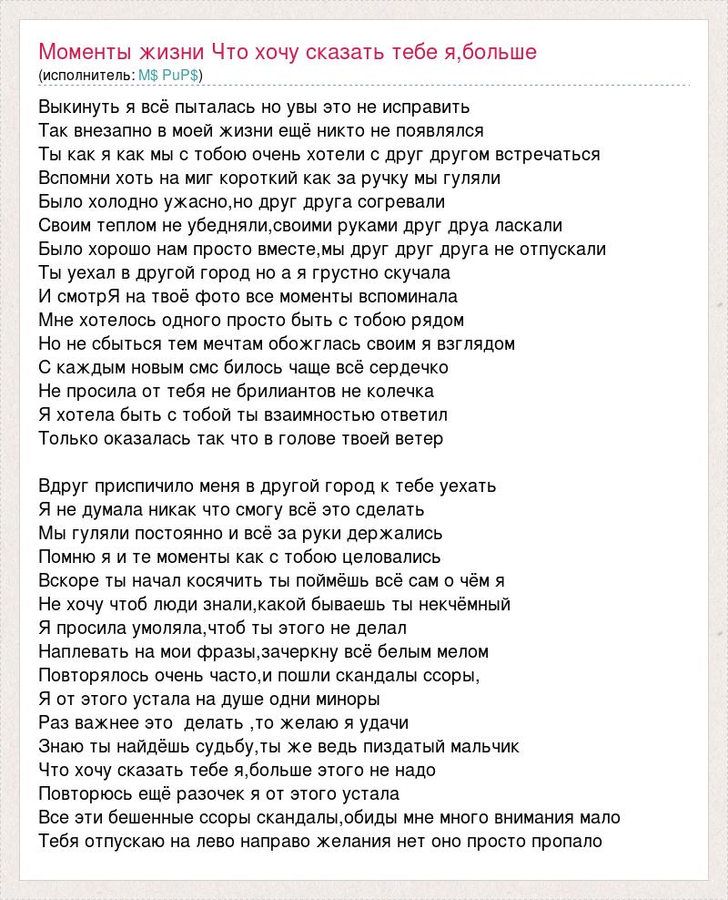 Выкинуть я всё пыталась но увы это не исправить Так внезапно в моей жизни ещё никто не появлялся Ты как я как мы с тобою очень хотели с друг другом встречаться Вспомни хоть на миг короткий как за ручку мы гуляли Было холодно ужасно,но друг друга согревали Своим теплом не убедняли,своими руками друг друа ласкали Было хорошо нам просто вместе,мы друг друг друга не отпускали Ты уехал в другой город но а я грустно скучала И смотрЯ на твоё фото все моменты вспоминала Мне хотелось одного просто быть с тобою рядом Но не сбыться тем мечтам обожглась своим я взглядом С каждым новым смс билось чаще всё сердечко Не просила от тебя не брилиантов не колечка Я хотела быть с тобой ты взаимностью ответил Только оказалась так что в голове твоей ветер Вдруг приспичило меня в другой город к тебе уехать Я не думала никак что смогу всё это сделать Мы гуляли постоянно и всё за руки держались Помню я и те моменты как с тобою целовались Вскоре ты начал косячить ты поймёшь всё сам о чём я Не хочу чтоб люди знали,какой бываешь ты некчёмный Я просила умоляла,чтоб ты этого не делал Наплевать на мои фразы,зачеркну всё белым мелом Повторялось очень часто,и пошли скандалы ссоры, Я от этого устала на душе одни миноры Раз важнее это делать ,то желаю я удачи Знаю ты найдёшь судьбу,ты же ведь пиздатый мальчик Что хочу сказать тебе я,больше этого не надо Повторюсь ещё разочек я от этого устала Все эти бешенные ссоры скандалы,обиды мне много внимания мало Тебя отпускаю на лево направо желания нет оно просто пропало