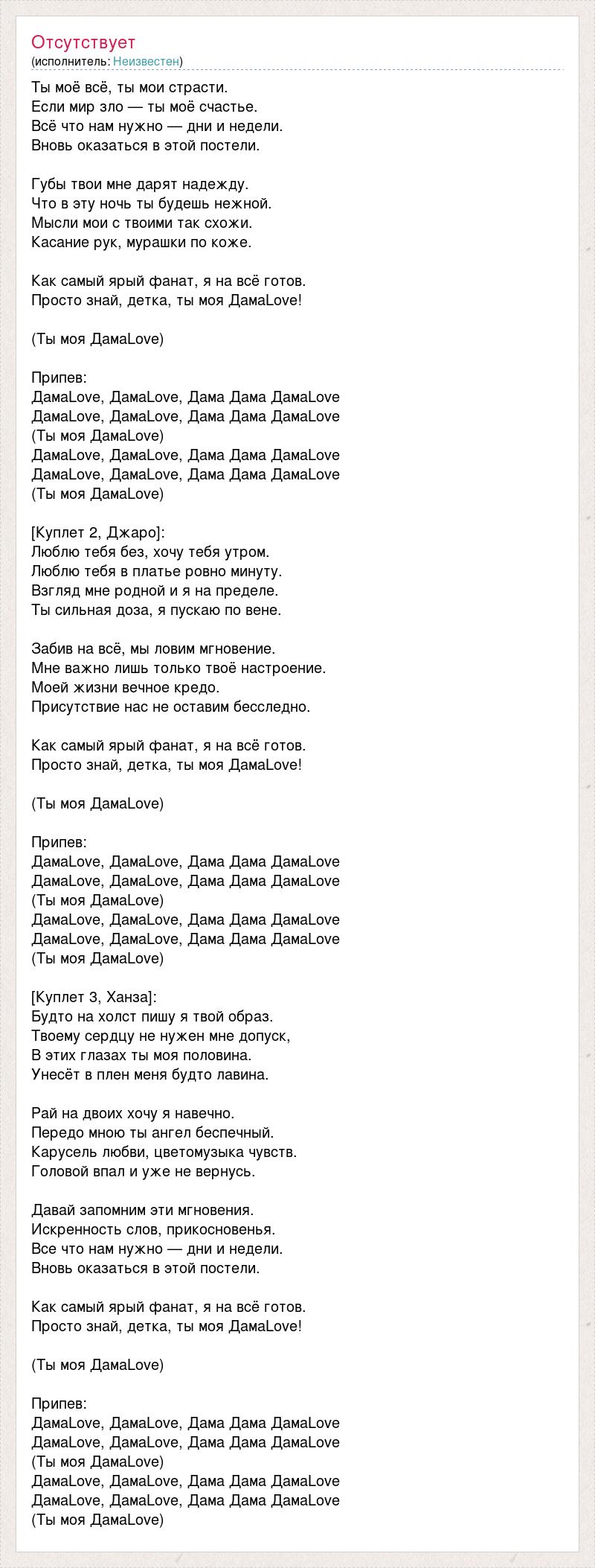 Ты моё всё, ты мои страсти. Если мир зло — ты моё счастье. Всё что нам нужно — дни и недели. Вновь оказаться в этой постели. Губы твои мне дарят надежду. Что в эту ночь ты будешь нежной. Мысли мои с твоими так схожи. Касание рук, мурашки по коже. Как самый ярый фанат, я на всё готов. Просто знай, детка, ты моя ДамаLove! (Ты моя ДамаLove) Припев: ДамаLove, ДамаLove, Дама Дама ДамаLove ДамаLove, ДамаLove, Дама Дама ДамаLove (Ты моя ДамаLove) ДамаLove, ДамаLove, Дама Дама ДамаLove ДамаLove, ДамаLove, Дама Дама ДамаLove (Ты моя ДамаLove) [Куплет 2, Джаро]: Люблю тебя без, хочу тебя утром. Люблю тебя в платье ровно минуту. Взгляд мне родной и я на пределе. Ты сильная доза, я пускаю по вене. Забив на всё, мы ловим мгновение. Мне важно лишь только твоё настроение. Моей жизни вечное кредо. Присутствие нас не оставим бесследно. Как самый ярый фанат, я на всё готов. Просто знай, детка, ты моя ДамаLove! (Ты моя ДамаLove) Припев: ДамаLove, ДамаLove, Дама Дама ДамаLove ДамаLove, ДамаLove, Дама Дама ДамаLove (Ты моя ДамаLove) ДамаLove, ДамаLove, Дама Дама ДамаLove ДамаLove, ДамаLove, Дама Дама ДамаLove (Ты моя ДамаLove) [Куплет 3, Ханза]: Будто на холст пишу я твой образ. Твоему сердцу не нужен мне допуск, В этих глазах ты моя половина. Унесёт в плен меня будто лавина. Рай на двоих хочу я навечно. Передо мною ты ангел беспечный. Карусель любви, цветомузыка чувств. Головой впал и уже не вернусь. Давай запомним эти мгновения. Искренность слов, прикосновенья. Все что нам нужно — дни и недели. Вновь оказаться в этой постели. Как самый ярый фанат, я на всё готов. Просто знай, детка, ты моя ДамаLove! (Ты моя ДамаLove) Припев: ДамаLove, ДамаLove, Дама Дама ДамаLove ДамаLove, ДамаLove, Дама Дама ДамаLove (Ты моя ДамаLove) ДамаLove, ДамаLove, Дама Дама ДамаLove ДамаLove, ДамаLove, Дама Дама ДамаLove (Ты моя ДамаLove)