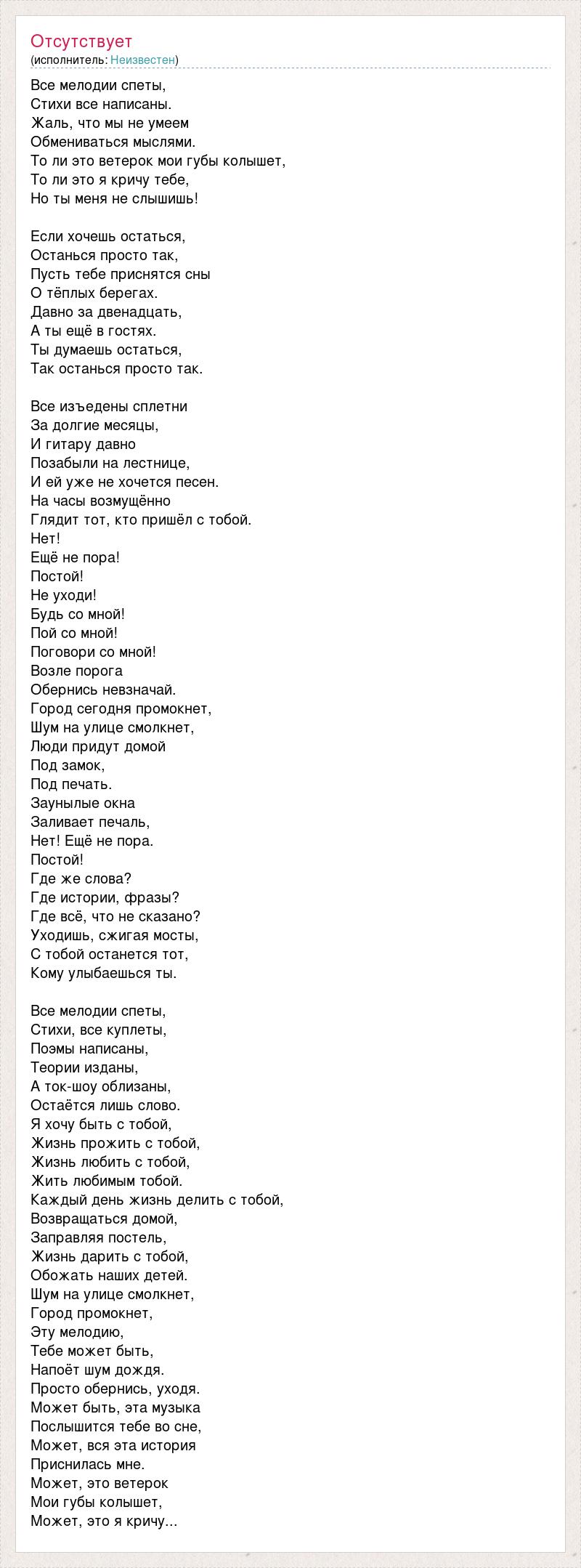 Все мелодии спеты, Стихи все написаны. Жаль, что мы не умеем Обмениваться мыслями. То ли это ветерок мои губы колышет, То ли это я кричу тебе, Но ты меня не слышишь! Если хочешь остаться, Останься просто так, Пусть тебе приснятся сны О тёплых берегах. Давно за двенадцать, А ты ещё в гостях. Ты думаешь остаться, Так останься просто так. Все изъедены сплетни За долгие месяцы, И гитару давно Позабыли на лестнице, И ей уже не хочется песен. На часы возмущённо Глядит тот, кто пришёл с тобой. Нет! Ещё не пора! Постой! Не уходи! Будь со мной! Пой со мной! Поговори со мной! Возле порога Обернись невзначай. Город сегодня промокнет, Шум на улице смолкнет, Люди придут домой Под замок, Под печать. Заунылые окна Заливает печаль, Нет! Ещё не пора. Постой! Где же слова? Где истории, фразы? Где всё, что не сказано? Уходишь, сжигая мосты, С тобой останется тот, Кому улыбаешься ты. Все мелодии спеты, Стихи, все куплеты, Поэмы написаны, Теории изданы, А ток-шоу облизаны, Остаётся лишь слово. Я хочу быть с тобой, Жизнь прожить с тобой, Жизнь любить с тобой, Жить любимым тобой. Каждый день жизнь делить с тобой, Возвращаться домой, Заправляя постель, Жизнь дарить с тобой, Обожать наших детей. Шум на улице смолкнет, Город промокнет, Эту мелодию, Тебе может быть, Напоёт шум дождя. Просто обернись, уходя. Может быть, эта музыка Послышится тебе во сне, Может, вся эта история Приснилась мне. Может, это ветерок Мои губы колышет, Может, это я кричу...