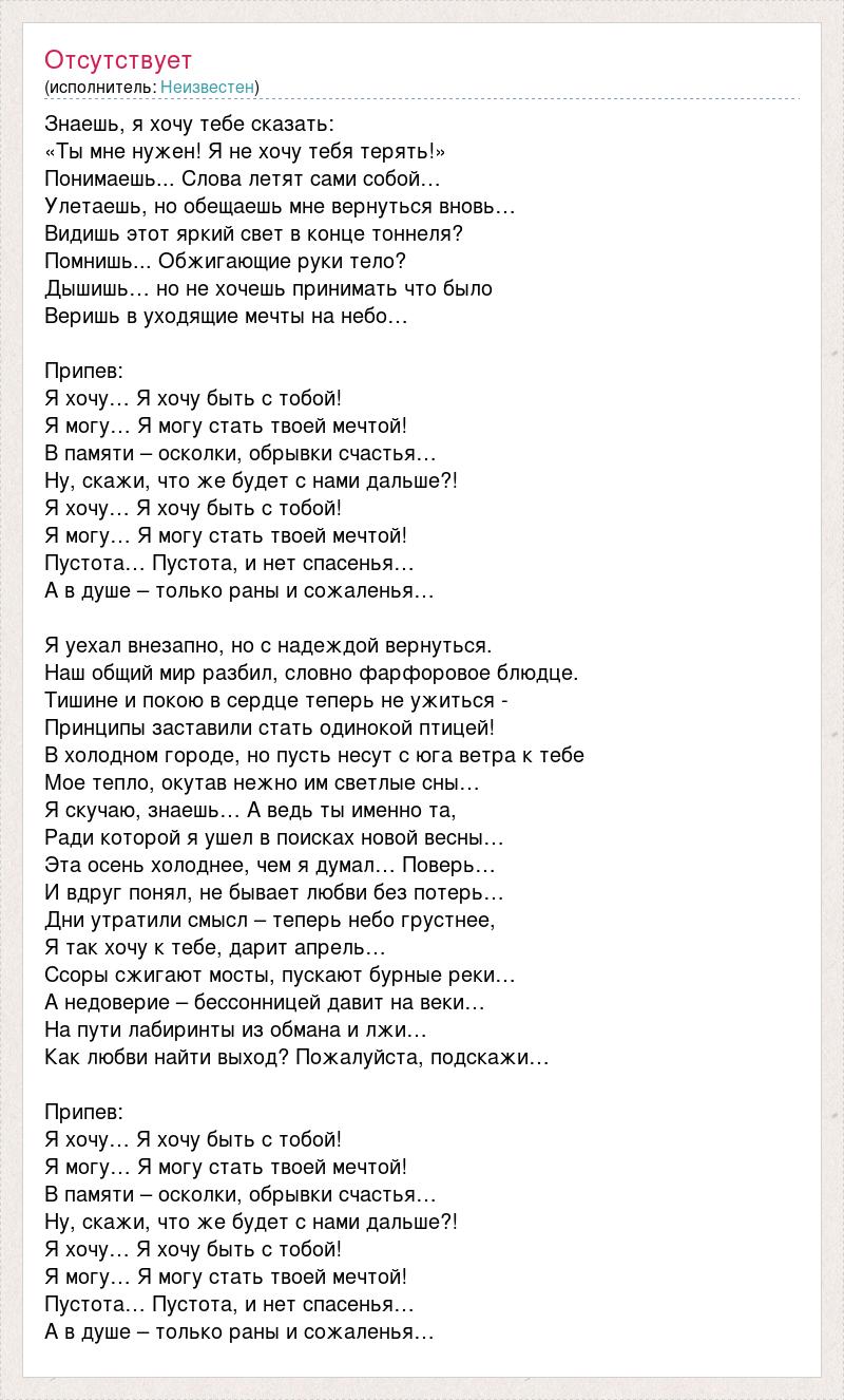 Знаешь, я хочу тебе сказать: «Ты мне нужен! Я не хочу тебя терять!» Понимаешь... Слова летят сами собой… Улетаешь, но обещаешь мне вернуться вновь… Видишь этот яркий свет в конце тоннеля? Помнишь... Обжигающие руки тело? Дышишь… но не хочешь принимать что было Веришь в уходящие мечты на небо… Припев: Я хочу… Я хочу быть с тобой! Я могу… Я могу стать твоей мечтой! В памяти – осколки, обрывки счастья… Ну, скажи, что же будет с нами дальше?! Я хочу… Я хочу быть с тобой! Я могу… Я могу стать твоей мечтой! Пустота… Пустота, и нет спасенья… А в душе – только раны и сожаленья… Я уехал внезапно, но с надеждой вернуться. Наш общий мир разбил, словно фарфоровое блюдце. Тишине и покою в сердце теперь не ужиться - Принципы заставили стать одинокой птицей! В холодном городе, но пусть несут с юга ветра к тебе Мое тепло, окутав нежно им светлые сны… Я скучаю, знаешь… А ведь ты именно та, Ради которой я ушел в поисках новой весны… Эта осень холоднее, чем я думал… Поверь… И вдруг понял, не бывает любви без потерь… Дни утратили смысл – теперь небо грустнее, Я так хочу к тебе, дарит апрель… Ссоры сжигают мосты, пускают бурные реки… А недоверие – бессонницей давит на веки… На пути лабиринты из обмана и лжи… Как любви найти выход? Пожалуйста, подскажи… Припев: Я хочу… Я хочу быть с тобой! Я могу… Я могу стать твоей мечтой! В памяти – осколки, обрывки счастья… Ну, скажи, что же будет с нами дальше?! Я хочу… Я хочу быть с тобой! Я могу… Я могу стать твоей мечтой! Пустота… Пустота, и нет спасенья… А в душе – только раны и сожаленья…