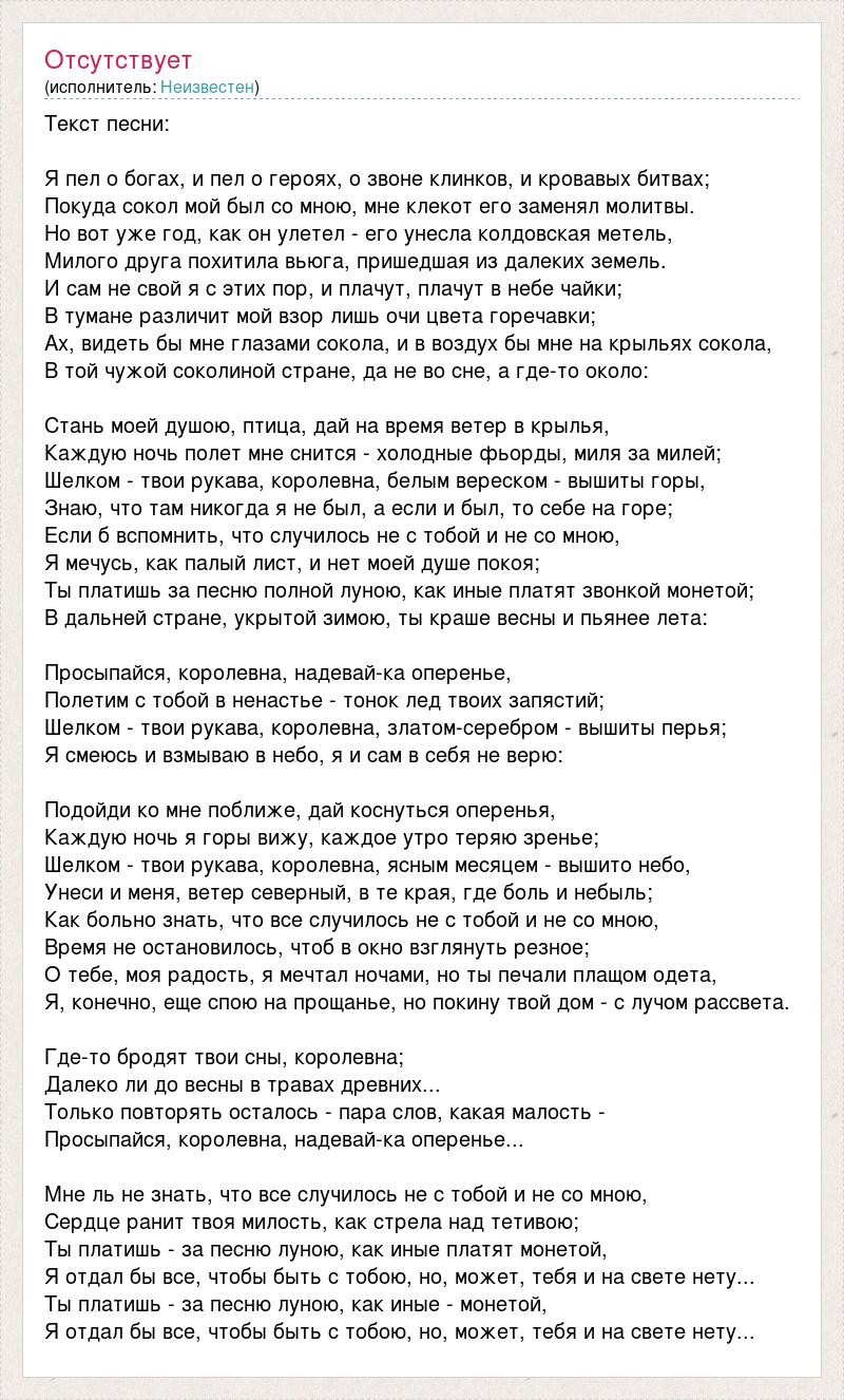 Текст песни: Я пел о богах, и пел о героях, о звоне клинков, и кровавых битвах; Покуда сокол мой был со мною, мне клекот его заменял молитвы. Но вот уже год, как он улетел - его унесла колдовская метель, Милого друга похитила вьюга, пришедшая из далеких земель. И сам не свой я с этих пор, и плачут, плачут в небе чайки; В тумане различит мой взор лишь очи цвета горечавки; Ах, видеть бы мне глазами сокола, и в воздух бы мне на крыльях сокола, В той чужой соколиной стране, да не во сне, а где-то около: Стань моей душою, птица, дай на время ветер в крылья, Каждую ночь полет мне снится - холодные фьорды, миля за милей; Шелком - твои рукава, королевна, белым вереском - вышиты горы, Знаю, что там никогда я не был, а если и был, то себе на горе; Если б вспомнить, что случилось не с тобой и не со мною, Я мечусь, как палый лист, и нет моей душе покоя; Ты платишь за песню полной луною, как иные платят звонкой монетой; В дальней стране, укрытой зимою, ты краше весны и пьянее лета: Просыпайся, королевна, надевай-ка оперенье, Полетим с тобой в ненастье - тонок лед твоих запястий; Шелком - твои рукава, королевна, златом-серебром - вышиты перья; Я смеюсь и взмываю в небо, я и сам в себя не верю: Подойди ко мне поближе, дай коснуться оперенья, Каждую ночь я горы вижу, каждое утро теряю зренье; Шелком - твои рукава, королевна, ясным месяцем - вышито небо, Унеси и меня, ветер северный, в те края, где боль и небыль; Как больно знать, что все случилось не с тобой и не со мною, Время не остановилось, чтоб в окно взглянуть резное; О тебе, моя радость, я мечтал ночами, но ты печали плащом одета, Я, конечно, еще спою на прощанье, но покину твой дом - с лучом рассвета. Где-то бродят твои сны, королевна; Далеко ли до весны в травах древних... Только повторять осталось - пара слов, какая малость - Просыпайся, королевна, надевай-ка оперенье... Мне ль не знать, что все случилось не с тобой и не со мною, Сердце ранит твоя милость, как стрела над тетивою; Ты платишь - за песню луною, как иные платят монетой, Я отдал бы все, чтобы быть с тобою, но, может, тебя и на свете нету... Ты платишь - за песню луною, как иные - монетой, Я отдал бы все, чтобы быть с тобою, но, может, тебя и на свете нету...
