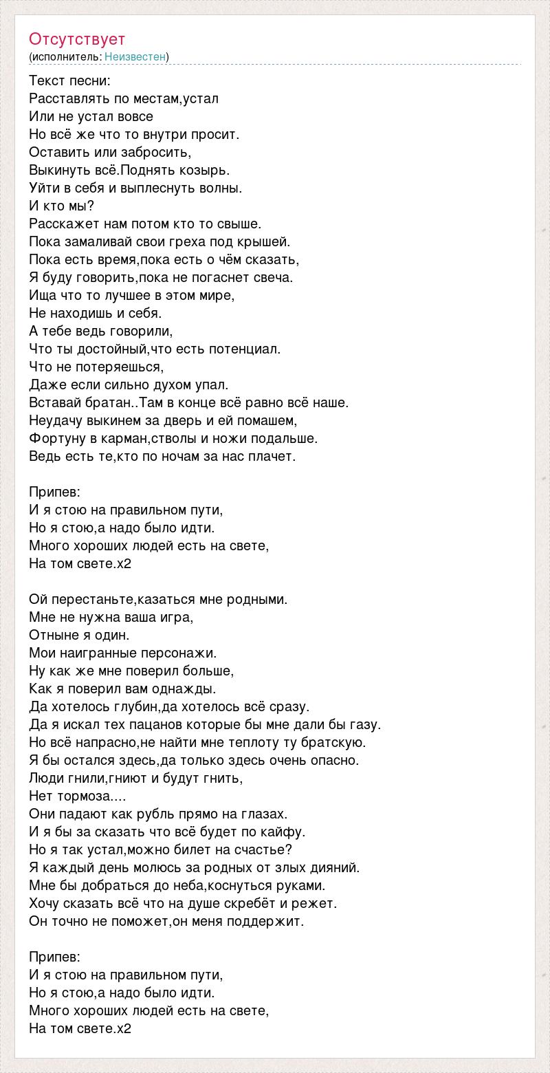 Текст песни: Расставлять по местам,устал Или не устал вовсе Но всё же что то внутри просит. Оставить или забросить, Выкинуть всё.Поднять козырь. Уйти в себя и выплеснуть волны. И кто мы? Расскажет нам потом кто то свыше. Пока замаливай свои греха под крышей. Пока есть время,пока есть о чём сказать, Я буду говорить,пока не погаснет свеча. Ища что то лучшее в этом мире, Не находишь и себя. А тебе ведь говорили, Что ты достойный,что есть потенциал. Что не потеряешься, Даже если сильно духом упал. Вставай братан..Там в конце всё равно всё наше. Неудачу выкинем за дверь и ей помашем, Фортуну в карман,стволы и ножи подальше. Ведь есть те,кто по ночам за нас плачет. Припев: И я стою на правильном пути, Но я стою,а надо было идти. Много хороших людей есть на свете, На том свете.х2 Ой перестаньте,казаться мне родными. Мне не нужна ваша игра, Отныне я один. Мои наигранные персонажи. Ну как же мне поверил больше, Как я поверил вам однажды. Да хотелось глубин,да хотелось всё сразу. Да я искал тех пацанов которые бы мне дали бы газу. Но всё напрасно,не найти мне теплоту ту братскую. Я бы остался здесь,да только здесь очень опасно. Люди гнили,гниют и будут гнить, Нет тормоза.... Они падают как рубль прямо на глазах. И я бы за сказать что всё будет по кайфу. Но я так устал,можно билет на счастье? Я каждый день молюсь за родных от злых дияний. Мне бы добраться до неба,коснуться руками. Хочу сказать всё что на душе скребёт и режет. Он точно не поможет,он меня поддержит. Припев: И я стою на правильном пути, Но я стою,а надо было идти. Много хороших людей есть на свете, На том свете.х2