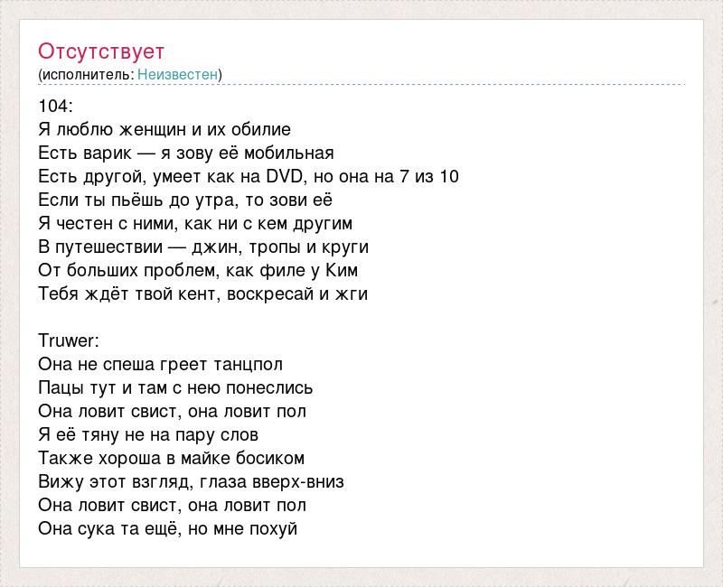 104: Я люблю женщин и их обилие Есть варик — я зову её мобильная Есть другой, умеет как на DVD, но она на 7 из 10 Если ты пьёшь до утра, то зови её Я честен с ними, как ни с кем другим В путешествии — джин, тропы и круги От больших проблем, как филе у Ким Тебя ждёт твой кент, воскресай и жги Truwer: Она не спеша греет танцпол Пацы тут и там с нею понеслись Она ловит свист, она ловит пол Я её тяну не на пару слов Также хороша в майке босиком Вижу этот взгляд, глаза вверх-вниз Она ловит свист, она ловит пол Она сука та ещё, но мне похуй