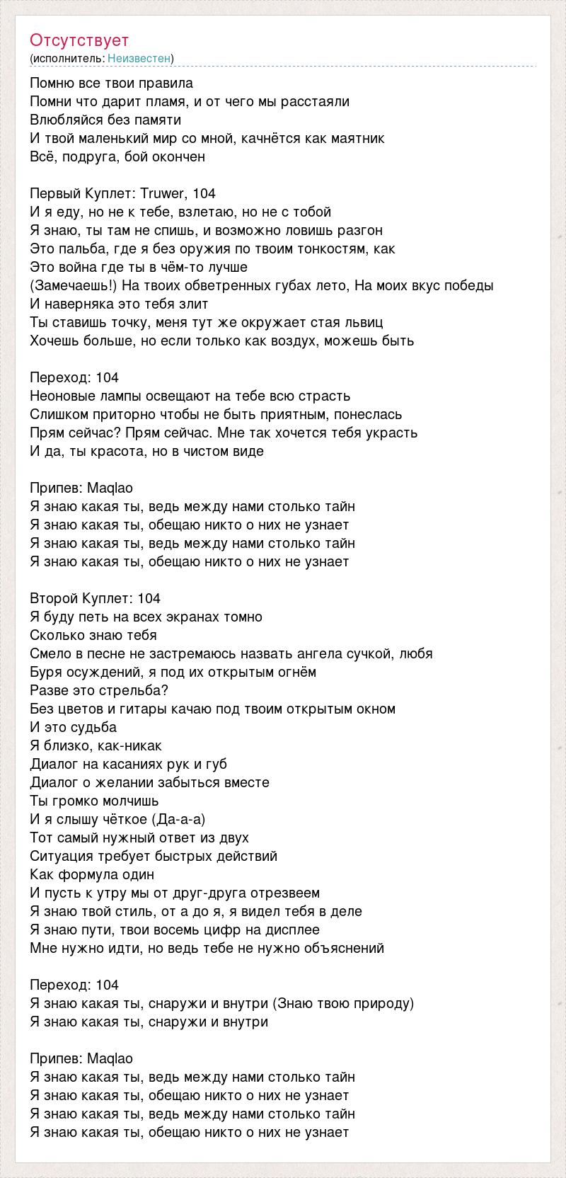 Помню все твои правила Помни что дарит пламя, и от чего мы расстаяли Влюбляйся без памяти И твой маленький мир со мной, качнётся как маятник Всё, подруга, бой окончен Первый Куплет: Truwer, 104 И я еду, но не к тебе, взлетаю, но не с тобой Я знаю, ты там не спишь, и возможно ловишь разгон Это пальба, где я без оружия по твоим тонкостям, как Это война где ты в чём-то лучше (Замечаешь!) На твоих обветренных губах лето, На моих вкус победы И наверняка это тебя злит Ты ставишь точку, меня тут же окружает стая львиц Хочешь больше, но если только как воздух, можешь быть Переход: 104 Неоновые лампы освещают на тебе всю страсть Слишком приторно чтобы не быть приятным, понеслась Прям сейчас? Прям сейчас. Мне так хочется тебя украсть И да, ты красота, но в чистом виде Припев: Maqlao Я знаю какая ты, ведь между нами столько тайн Я знаю какая ты, обещаю никто о них не узнает Я знаю какая ты, ведь между нами столько тайн Я знаю какая ты, обещаю никто о них не узнает Второй Куплет: 104 Я буду петь на всех экранах томно Сколько знаю тебя Смело в песне не застремаюсь назвать ангела сучкой, любя Буря осуждений, я под их открытым огнём Разве это стрельба? Без цветов и гитары качаю под твоим открытым окном И это судьба Я близко, как-никак Диалог на касаниях рук и губ Диалог о желании забыться вместе Ты громко молчишь И я слышу чёткое (Да-а-а) Тот самый нужный ответ из двух Ситуация требует быстрых действий Как формула один И пусть к утру мы от друг-друга отрезвеем Я знаю твой стиль, от а до я, я видел тебя в деле Я знаю пути, твои восемь цифр на дисплее Мне нужно идти, но ведь тебе не нужно объяснений Переход: 104 Я знаю какая ты, снаружи и внутри (Знаю твою природу) Я знаю какая ты, снаружи и внутри Припев: Maqlao Я знаю какая ты, ведь между нами столько тайн Я знаю какая ты, обещаю никто о них не узнает Я знаю какая ты, ведь между нами столько тайн Я знаю какая ты, обещаю никто о них не узнает