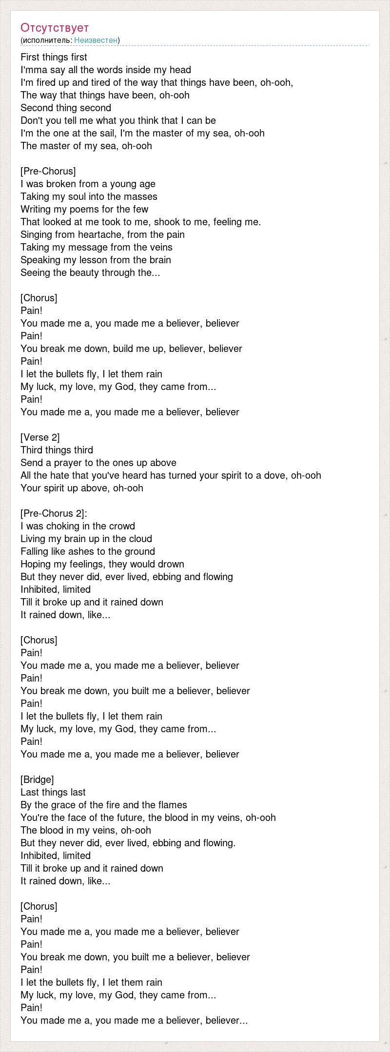 First things first I'mma say all the words inside my head I'm fired up and tired of the way that things have been, oh-ooh, The way that things have been, oh-ooh Second thing second Don't you tell me what you think that I can be I'm the one at the sail, I'm the master of my sea, oh-ooh The master of my sea, oh-ooh [Pre-Chorus] I was broken from a young age Taking my soul into the masses Writing my poems for the few That looked at me took to me, shook to me, feeling me. Singing from heartache, from the pain Taking my message from the veins Speaking my lesson from the brain Seeing the beauty through the... [Chorus] Pain! You made me a, you made me a believer, believer Pain! You break me down, build me up, believer, believer Pain! I let the bullets fly, I let them rain My luck, my love, my God, they came from... Pain! You made me a, you made me a believer, believer [Verse 2] Third things third Send a prayer to the ones up above All the hate that you've heard has turned your spirit to a dove, oh-ooh Your spirit up above, oh-ooh [Pre-Chorus 2]: I was choking in the crowd Living my brain up in the cloud Falling like ashes to the ground Hoping my feelings, they would drown But they never did, ever lived, ebbing and flowing Inhibited, limited Till it broke up and it rained down It rained down, like... [Chorus] Pain! You made me a, you made me a believer, believer Pain! You break me down, you built me a believer, believer Pain! I let the bullets fly, I let them rain My luck, my love, my God, they came from... Pain! You made me a, you made me a believer, believer [Bridge] Last things last By the grace of the fire and the flames You're the face of the future, the blood in my veins, oh-ooh The blood in my veins, oh-ooh But they never did, ever lived, ebbing and flowing. Inhibited, limited Till it broke up and it rained down It rained down, like... [Chorus] Pain! You made me a, you made me a believer, believer Pain! You break me down, you built me a believer, believer Pain! I let the bullets fly, I let them rain My luck, my love, my God, they came from... Pain! You made me a, you made me a believer, believer...