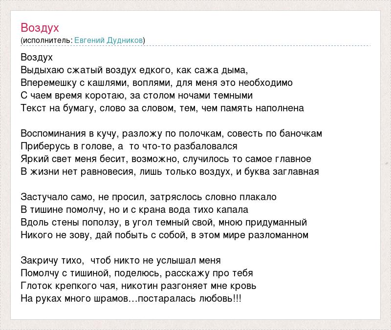 Воздух Выдыхаю сжатый воздух едкого, как сажа дыма, Вперемешку с кашлями, воплями, для меня это необходимо С чаем время коротаю, за столом ночами темными Текст на бумагу, слово за словом, тем, чем память наполнена Воспоминания в кучу, разложу по полочкам, совесть по баночкам Приберусь в голове, а то что-то разбаловался Яркий свет меня бесит, возможно, случилось то самое главное В жизни нет равновесия, лишь только воздух, и буква заглавная Застучало само, не просил, затряслось словно плакало В тишине помолчу, но и с крана вода тихо капала Вдоль стены поползу, в угол темный свой, мною придуманный Никого не зову, дай побыть с собой, в этом мире разломанном Закричу тихо, чтоб никто не услышал меня Помолчу с тишиной, поделюсь, расскажу про тебя Глоток крепкого чая, никотин разгоняет мне кровь На руках много шрамов…постаралась любовь!!!