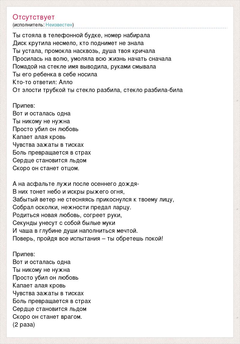 Ты стояла в телефонной будке, номер набирала Диск крутила несмело, кто поднимет не знала Ты устала, промокла насквозь, душа твоя кричала Просилась на волю, умоляла всю жизнь начать сначала Помадой на стекле имя выводила, руками смывала Ты его ребенка в себе носила Кто-то ответил: Алло От злости трубкой ты стекло разбила, стекло разбила-била Припев: Вот и осталась одна Ты никому не нужна Просто убил он любовь Капает алая кровь Чувства зажаты в тисках Боль превращается в страх Сердце становится льдом Скоро он станет отцом. А на асфальте лужи после осеннего дождя- В них тонет небо и искры рыжего огня, Забытый ветер не стесняясь прикоснулся к твоему лицу, Собрал осколки, нежности предал ларцу. Родиться новая любовь, согреет руки, Секунды унесут с собой былые муки И чаша в глубине души наполниться мечтой. Поверь, пройдя все испытания – ты обретешь покой! Припев: Вот и осталась одна Ты никому не нужна Просто убил он любовь Капает алая кровь Чувства зажаты в тисках Боль превращается в страх Сердце становится льдом Скоро он станет врагом. (2 раза)