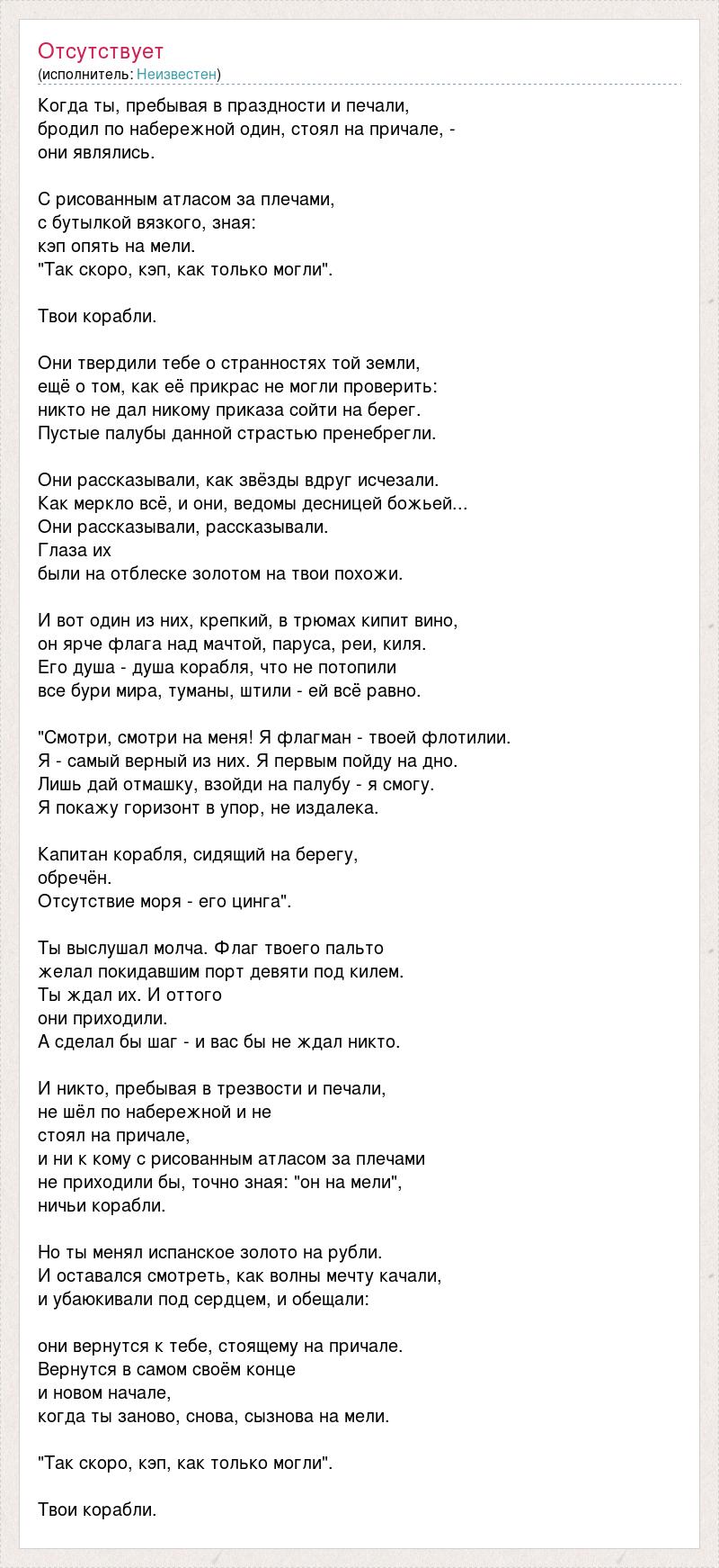 Когда ты, пребывая в праздности и печали, бродил по набережной один, стоял на причале, - они являлись. С рисованным атласом за плечами, с бутылкой вязкого, зная: кэп опять на мели. "Так скоро, кэп, как только могли". Твои корабли. Они твердили тебе о странностях той земли, ещё о том, как её прикрас не могли проверить: никто не дал никому приказа сойти на берег. Пустые палубы данной страстью пренебрегли. Они рассказывали, как звёзды вдруг исчезали. Как меркло всё, и они, ведомы десницей божьей... Они рассказывали, рассказывали. Глаза их были на отблеске золотом на твои похожи. И вот один из них, крепкий, в трюмах кипит вино, он ярче флага над мачтой, паруса, реи, киля. Его душа - душа корабля, что не потопили все бури мира, туманы, штили - ей всё равно. "Смотри, смотри на меня! Я флагман - твоей флотилии. Я - самый верный из них. Я первым пойду на дно. Лишь дай отмашку, взойди на палубу - я смогу. Я покажу горизонт в упор, не издалека. Капитан корабля, сидящий на берегу, обречён. Отсутствие моря - его цинга". Ты выслушал молча. Флаг твоего пальто желал покидавшим порт девяти под килем. Ты ждал их. И оттого они приходили. А сделал бы шаг - и вас бы не ждал никто. И никто, пребывая в трезвости и печали, не шёл по набережной и не стоял на причале, и ни к кому с рисованным атласом за плечами не приходили бы, точно зная: "он на мели", ничьи корабли. Но ты менял испанское золото на рубли. И оставался смотреть, как волны мечту качали, и убаюкивали под сердцем, и обещали: они вернутся к тебе, стоящему на причале. Вернутся в самом своём конце и новом начале, когда ты заново, снова, сызнова на мели. "Так скоро, кэп, как только могли". Твои корабли.