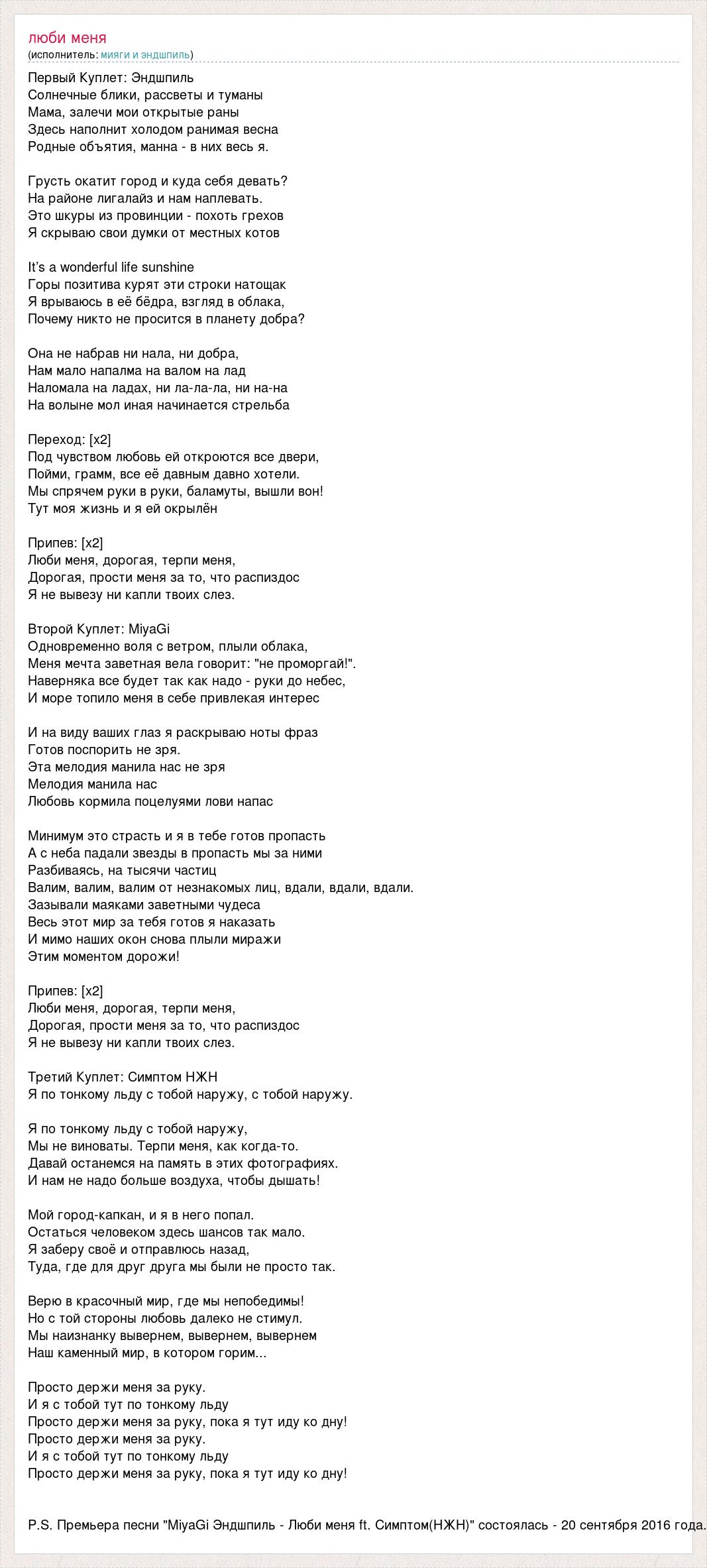 Первый Куплет: Эндшпиль Солнечные блики, рассветы и туманы Мама, залечи мои открытые раны Здесь наполнит холодом ранимая весна Родные объятия, манна - в них весь я. Грусть окатит город и куда себя девать? На районе лигалайз и нам наплевать. Это шкуры из провинции - похоть грехов Я скрываю свои думки от местных котов It’s a wonderful life sunshine Горы позитива курят эти строки натощак Я врываюсь в её бёдра, взгляд в облака, Почему никто не просится в планету добра? Она не набрав ни нала, ни добра, Нам мало напалма на валом на лад Наломала на ладах, ни ла-ла-ла, ни на-на На волыне мол иная начинается стрельба Переход: [х2] Под чувством любовь ей откроются все двери, Пойми, грамм, все её давным давно хотели. Мы спрячем руки в руки, баламуты, вышли вон! Тут моя жизнь и я ей окрылён Припев: [х2] Люби меня, дорогая, терпи меня, Дорогая, прости меня за то, что распиздос Я не вывезу ни капли твоих слез. Второй Куплет: MiyaGi Одновременно воля с ветром, плыли облака, Меня мечта заветная вела говорит: "не проморгай!". Наверняка все будет так как надо - руки до небес, И море топило меня в себе привлекая интерес И на виду ваших глаз я раскрываю ноты фраз Готов поспорить не зря. Эта мелодия манила нас не зря Мелодия манила нас Любовь кормила поцелуями лови напас Минимум это страсть и я в тебе готов пропасть А с неба падали звезды в пропасть мы за ними Разбиваясь, на тысячи частиц Валим, валим, валим от незнакомых лиц, вдали, вдали, вдали. Зазывали маяками заветными чудеса Весь этот мир за тебя готов я наказать И мимо наших окон снова плыли миражи Этим моментом дорожи! Припев: [х2] Люби меня, дорогая, терпи меня, Дорогая, прости меня за то, что распиздос Я не вывезу ни капли твоих слез. Третий Куплет: Симптом НЖН Я по тонкому льду с тобой наружу, с тобой наружу. Я по тонкому льду с тобой наружу, Мы не виноваты. Терпи меня, как когда-то. Давай останемся на память в этих фотографиях. И нам не надо больше воздуха, чтобы дышать! Мой город-капкан, и я в него попал. Остаться человеком здесь шансов так мало. Я заберу своё и отправлюсь назад, Туда, где для друг друга мы были не просто так. Верю в красочный мир, где мы непобедимы! Но с той стороны любовь далеко не стимул. Мы наизнанку вывернем, вывернем, вывернем Наш каменный мир, в котором горим... Просто держи меня за руку. И я с тобой тут по тонкому льду Просто держи меня за руку, пока я тут иду ко дну! Просто держи меня за руку. И я с тобой тут по тонкому льду Просто держи меня за руку, пока я тут иду ко дну! P.S. Премьера песни "MiyaGi Эндшпиль - Люби меня ft. Симптом(НЖН)" состоялась - 20 сентября 2016 года.