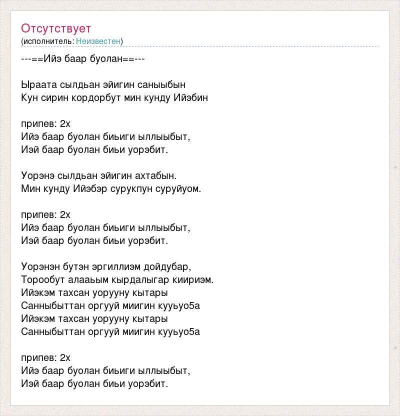 ---==Ийэ баар буолан==--- Ыраата сылдьан эйигин саныыбын Кун сирин кордорбут мин кунду Ийэбин припев: 2х Ийэ баар буолан биьиги ыллыыбыт, Иэй баар буолан биьи уорэбит. Уорэнэ сылдьан эйигин ахтабын. Мин кунду Ийэбэр сурукпун суруйуом. припев: 2х Ийэ баар буолан биьиги ыллыыбыт, Иэй баар буолан биьи уорэбит. Уорэнэн бутэн эргиллиэм дойдубар, Торообут алааьым кырдалыгар киириэм. Ийэкэм тахсан уорууну кытары Санныбыттан оргууй миигин кууьуо5а Ийэкэм тахсан уорууну кытары Санныбыттан оргууй миигин кууьуо5а припев: 2х Ийэ баар буолан биьиги ыллыыбыт, Иэй баар буолан биьи уорэбит.