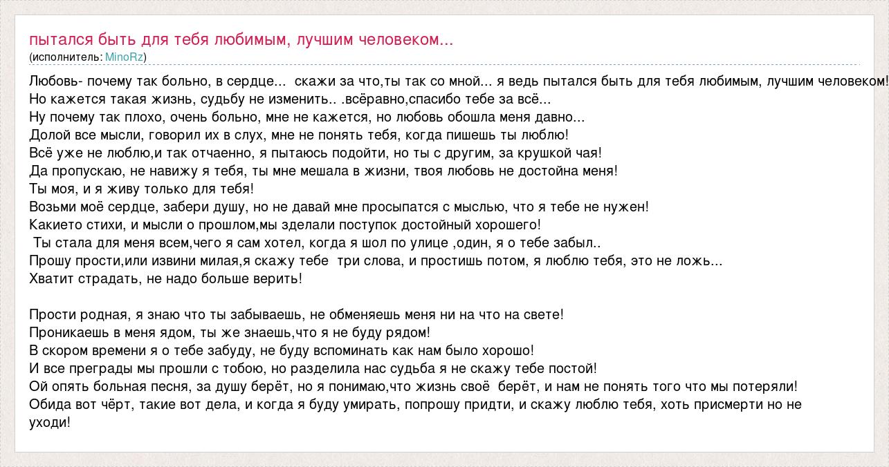 Любовь- почему так больно, в сердце... скажи за что,ты так со мной... я ведь пытался быть для тебя любимым, лучшим человеком! Но кажется такая жизнь, судьбу не изменить.. .всёравно,спасибо тебе за всё... Ну почему так плохо, очень больно, мне не кажется, но любовь обошла меня давно... Долой все мысли, говорил их в слух, мне не понять тебя, когда пишешь ты люблю! Всё уже не люблю,и так отчаенно, я пытаюсь подойти, но ты с другим, за крушкой чая! Да пропускаю, не навижу я тебя, ты мне мешала в жизни, твоя любовь не достойна меня! Ты моя, и я живу только для тебя! Возьми моё сердце, забери душу, но не давай мне просыпатся с мыслью, что я тебе не нужен! Какието стихи, и мысли о прошлом,мы зделали поступок достойный хорошего! Ты стала для меня всем,чего я сам хотел, когда я шол по улице ,один, я о тебе забыл.. Прошу прости,или извини милая,я скажу тебе три слова, и простишь потом, я люблю тебя, это не ложь... Хватит страдать, не надо больше верить! Прости родная, я знаю что ты забываешь, не обменяешь меня ни на что на свете! Проникаешь в меня ядом, ты же знаешь,что я не буду рядом! В скором времени я о тебе забуду, не буду вспоминать как нам было хорошо! И все преграды мы прошли с тобою, но разделила нас судьба я не скажу тебе постой! Ой опять больная песня, за душу берёт, но я понимаю,что жизнь своё берёт, и нам не понять того что мы потеряли! Обида вот чёрт, такие вот дела, и когда я буду умирать, попрошу придти, и скажу люблю тебя, хоть присмерти но не уходи!