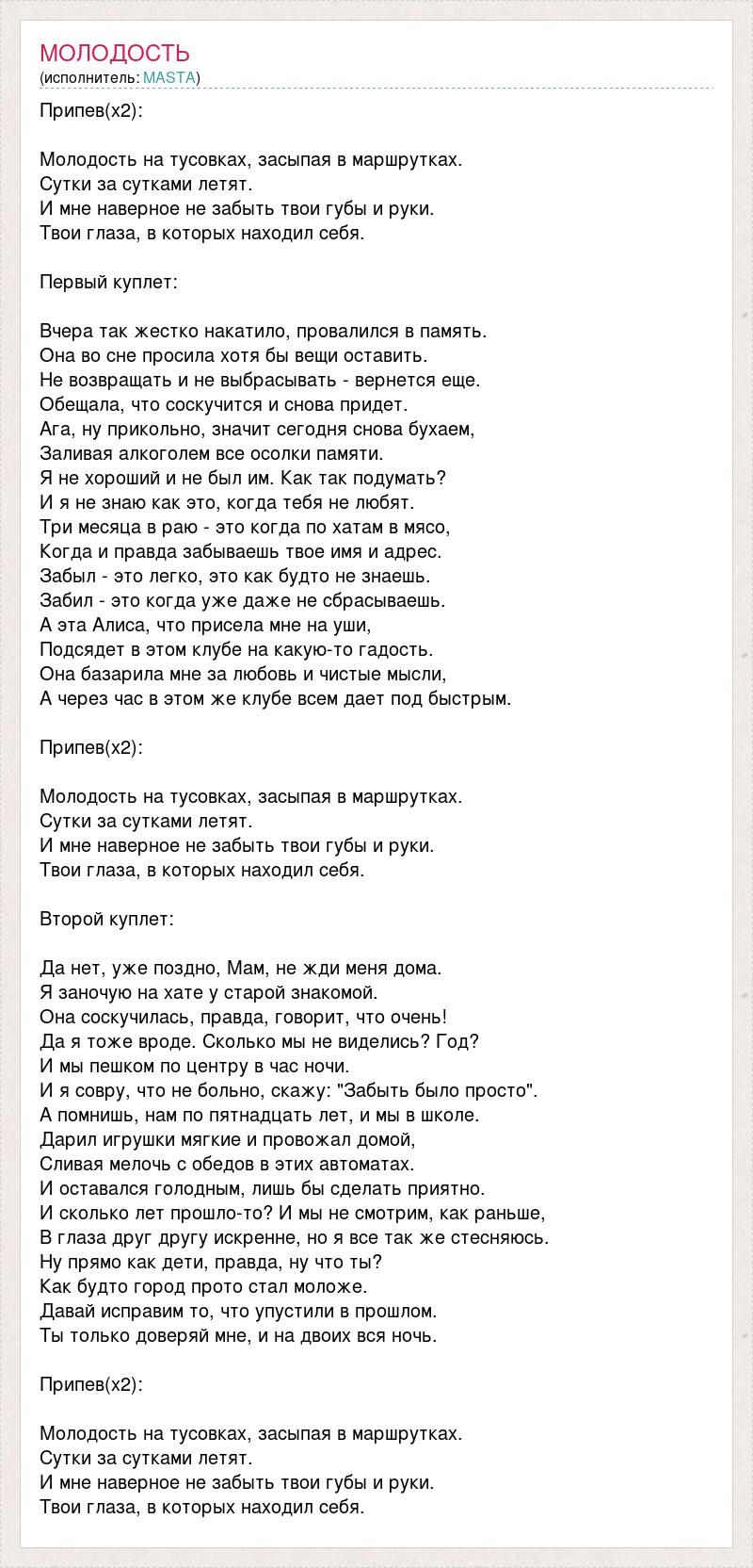 Припев(х2): Молодость на тусовках, засыпая в маршрутках. Сутки за сутками летят. И мне наверное не забыть твои губы и руки. Твои глаза, в которых находил себя. Первый куплет: Вчера так жестко накатило, провалился в память. Она во сне просила хотя бы вещи оставить. Не возвращать и не выбрасывать - вернется еще. Обещала, что соскучится и снова придет. Ага, ну прикольно, значит сегодня снова бухаем, Заливая алкоголем все осолки памяти. Я не хороший и не был им. Как так подумать? И я не знаю как это, когда тебя не любят. Три месяца в раю - это когда по хатам в мясо, Когда и правда забываешь твое имя и адрес. Забыл - это легко, это как будто не знаешь. Забил - это когда уже даже не сбрасываешь. А эта Алиса, что присела мне на уши, Подсядет в этом клубе на какую-то гадость. Она базарила мне за любовь и чистые мысли, А через час в этом же клубе всем дает под быстрым. Припев(х2): Молодость на тусовках, засыпая в маршрутках. Сутки за сутками летят. И мне наверное не забыть твои губы и руки. Твои глаза, в которых находил себя. Второй куплет: Да нет, уже поздно, Мам, не жди меня дома. Я заночую на хате у старой знакомой. Она соскучилась, правда, говорит, что очень! Да я тоже вроде. Сколько мы не виделись? Год? И мы пешком по центру в час ночи. И я совру, что не больно, скажу: "Забыть было просто". А помнишь, нам по пятнадцать лет, и мы в школе. Дарил игрушки мягкие и провожал домой, Сливая мелочь с обедов в этих автоматах. И оставался голодным, лишь бы сделать приятно. И сколько лет прошло-то? И мы не смотрим, как раньше, В глаза друг другу искренне, но я все так же стесняюсь. Ну прямо как дети, правда, ну что ты? Как будто город прото стал моложе. Давай исправим то, что упустили в прошлом. Ты только доверяй мне, и на двоих вся ночь. Припев(х2): Молодость на тусовках, засыпая в маршрутках. Сутки за сутками летят. И мне наверное не забыть твои губы и руки. Твои глаза, в которых находил себя.