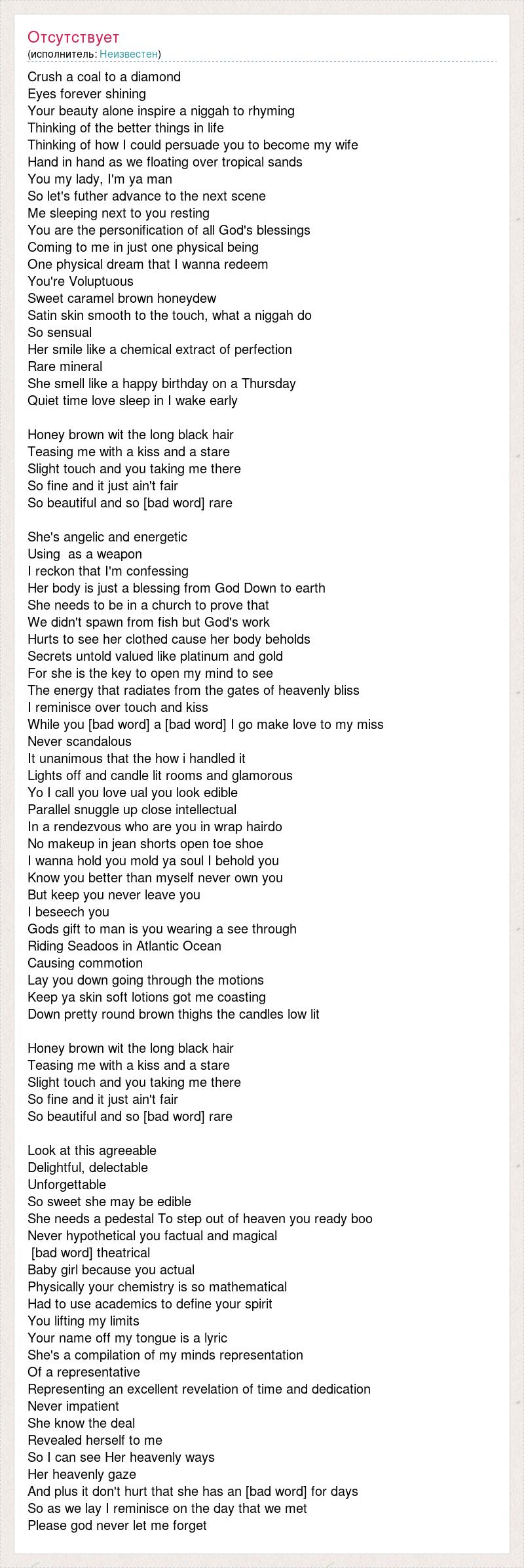 Crush a coal to a diamond Eyes forever shining Your beauty alone inspire a niggah to rhyming Thinking of the better things in life Thinking of how I could persuade you to become my wife Hand in hand as we floating over tropical sands You my lady, I'm ya man So let's futher advance to the next scene Me sleeping next to you resting You are the personification of all God's blessings Coming to me in just one physical being One physical dream that I wanna redeem You're Voluptuous Sweet caramel brown honeydew Satin skin smooth to the touch, what a niggah do So sensual Her smile like a chemical extract of perfection Rare mineral She smell like a happy birthday on a Thursday Quiet time love sleep in I wake early Honey brown wit the long black hair Teasing me with a kiss and a stare Slight touch and you taking me there So fine and it just ain't fair So beautiful and so [bad word] rare She's angelic and energetic Using as a weapon I reckon that I'm confessing Her body is just a blessing from God Down to earth She needs to be in a church to prove that We didn't spawn from fish but God's work Hurts to see her clothed cause her body beholds Secrets untold valued like platinum and gold For she is the key to open my mind to see The energy that radiates from the gates of heavenly bliss I reminisce over touch and kiss While you [bad word] a [bad word] I go make love to my miss Never scandalous It unanimous that the how i handled it Lights off and candle lit rooms and glamorous Yo I call you love ual you look edible Parallel snuggle up close intellectual In a rendezvous who are you in wrap hairdo No makeup in jean shorts open toe shoe I wanna hold you mold ya soul I behold you Know you better than myself never own you But keep you never leave you I beseech you Gods gift to man is you wearing a see through Riding Seadoos in Atlantic Ocean Causing commotion Lay you down going through the motions Keep ya skin soft lotions got me coasting Down pretty round brown thighs the candles low lit Honey brown wit the long black hair Teasing me with a kiss and a stare Slight touch and you taking me there So fine and it just ain't fair So beautiful and so [bad word] rare Look at this agreeable Delightful, delectable Unforgettable So sweet she may be edible She needs a pedestal To step out of heaven you ready boo Never hypothetical you factual and magical [bad word] theatrical Baby girl because you actual Physically your chemistry is so mathematical Had to use academics to define your spirit You lifting my limits Your name off my tongue is a lyric She's a compilation of my minds representation Of a representative Representing an excellent revelation of time and dedication Never impatient She know the deal Revealed herself to me So I can see Her heavenly ways Her heavenly gaze And plus it don't hurt that she has an [bad word] for days So as we lay I reminisce on the day that we met Please god never let me forget