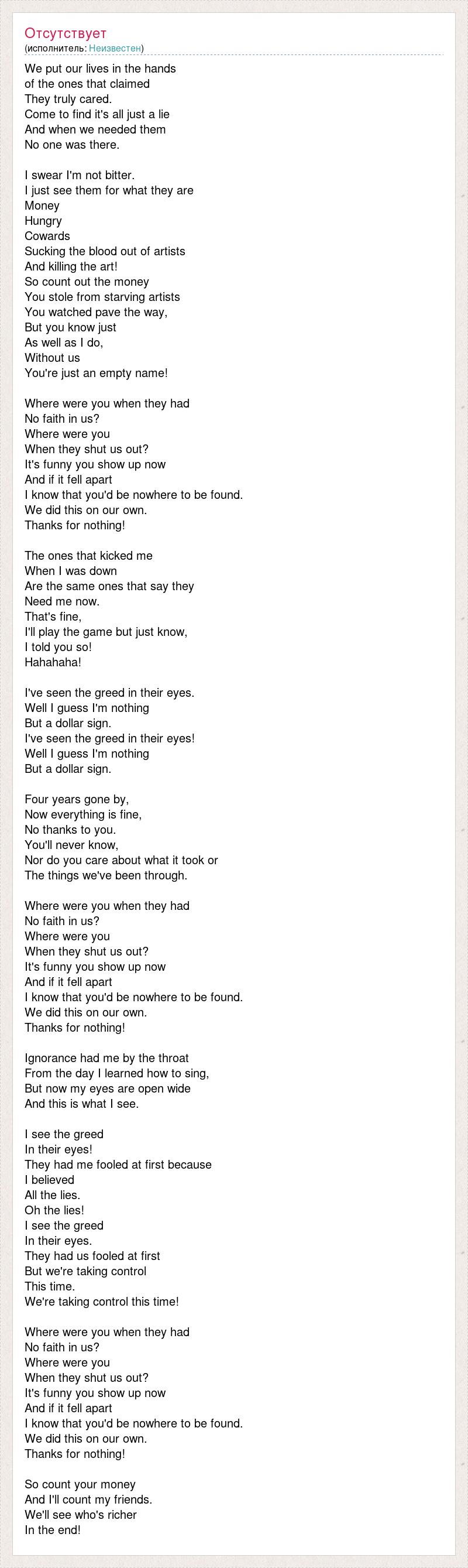 We put our lives in the hands of the ones that claimed They truly cared. Come to find it's all just a lie And when we needed them No one was there. I swear I'm not bitter. I just see them for what they are Money Hungry Cowards Sucking the blood out of artists And killing the art! So count out the money You stole from starving artists You watched pave the way, But you know just As well as I do, Without us You're just an empty name! Where were you when they had No faith in us? Where were you When they shut us out? It's funny you show up now And if it fell apart I know that you'd be nowhere to be found. We did this on our own. Thanks for nothing! The ones that kicked me When I was down Are the same ones that say they Need me now. That's fine, I'll play the game but just know, I told you so! Hahahaha! I've seen the greed in their eyes. Well I guess I'm nothing But a dollar sign. I've seen the greed in their eyes! Well I guess I'm nothing But a dollar sign. Four years gone by, Now everything is fine, No thanks to you. You'll never know, Nor do you care about what it took or The things we've been through. Where were you when they had No faith in us? Where were you When they shut us out? It's funny you show up now And if it fell apart I know that you'd be nowhere to be found. We did this on our own. Thanks for nothing! Ignorance had me by the throat From the day I learned how to sing, But now my eyes are open wide And this is what I see. I see the greed In their eyes! They had me fooled at first because I believed All the lies. Oh the lies! I see the greed In their eyes. They had us fooled at first But we're taking control This time. We're taking control this time! Where were you when they had No faith in us? Where were you When they shut us out? It's funny you show up now And if it fell apart I know that you'd be nowhere to be found. We did this on our own. Thanks for nothing! So count your money And I'll count my friends. We'll see who's richer In the end!
