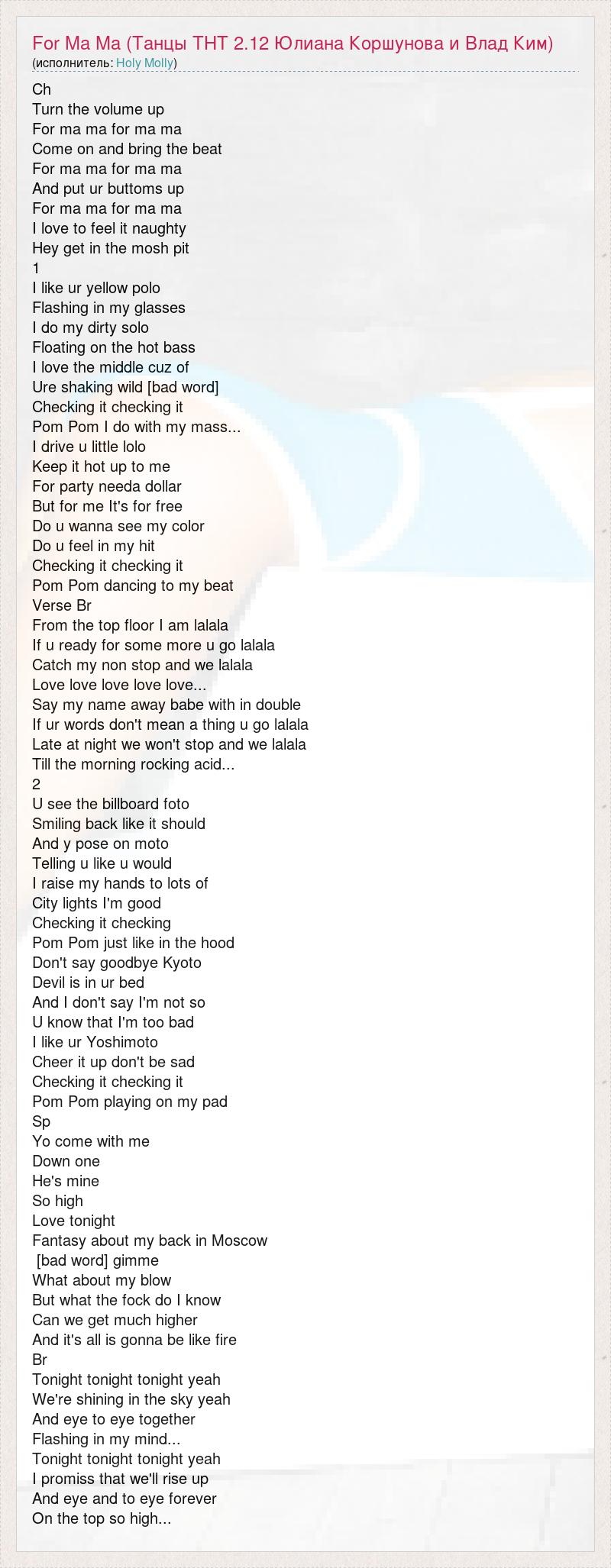 Ch Turn the volume up For ma ma for ma ma Come on and bring the beat For ma ma for ma ma And put ur buttoms up For ma ma for ma ma I love to feel it naughty Hey get in the mosh pit 1 I like ur yellow polo Flashing in my glasses I do my dirty solo Floating on the hot bass I love the middle cuz of Ure shaking wild [bad word] Checking it checking it Pom Pom I do with my mass... I drive u little lolo Keep it hot up to me For party needa dollar But for me It's for free Do u wanna see my color Do u feel in my hit Checking it checking it Pom Pom dancing to my beat Verse Br From the top floor I am lalala If u ready for some more u go lalala Catch my non stop and we lalala Love love love love love... Say my name away babe with in double If ur words don't mean a thing u go lalala Late at night we won't stop and we lalala Till the morning rocking acid... 2 U see the billboard foto Smiling back like it should And y pose on moto Telling u like u would I raise my hands to lots of City lights I'm good Checking it checking Pom Pom just like in the hood Don't say goodbye Kyoto Devil is in ur bed And I don't say I'm not so U know that I'm too bad I like ur Yoshimoto Cheer it up don't be sad Checking it checking it Pom Pom playing on my pad Sp Yo come with me Down one He's mine So high Love tonight Fantasy about my back in Moscow [bad word] gimme What about my blow But what the fock do I know Can we get much higher And it's all is gonna be like fire Br Tonight tonight tonight yeah We're shining in the sky yeah And eye to eye together Flashing in my mind... Tonight tonight tonight yeah I promiss that we'll rise up And eye and to eye forever On the top so high...