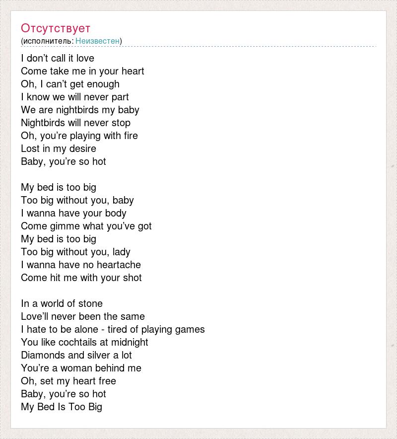 I don’t call it love Come take me in your heart Oh, I can’t get enough I know we will never part We are nightbirds my baby Nightbirds will never stop Oh, you’re playing with fire Lost in my desire Baby, you’re so hot My bed is too big Too big without you, baby I wanna have your body Come gimme what you’ve got My bed is too big Too big without you, lady I wanna have no heartache Come hit me with your shot In a world of stone Love’ll never been the same I hate to be alone - tired of playing games You like cochtails at midnight Diamonds and silver a lot You’re a woman behind me Oh, set my heart free Baby, you’re so hot My Bed Is Too Big