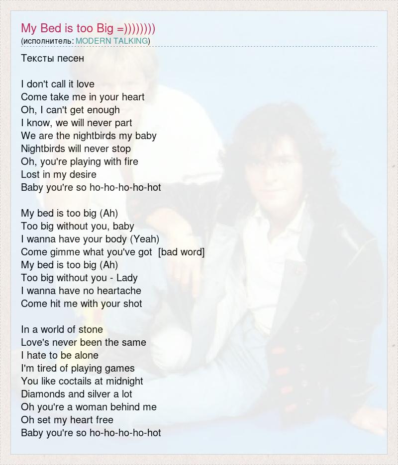 Тексты песен I don't call it love Come take me in your heart Oh, I can't get enough I know, we will never part We are the nightbirds my baby Nightbirds will never stop Oh, you're playing with fire Lost in my desire Baby you're so ho-ho-ho-ho-hot My bed is too big (Ah) Too big without you, baby I wanna have your body (Yeah) Come gimme what you've got [bad word] My bed is too big (Ah) Too big without you - Lady I wanna have no heartache Come hit me with your shot In a world of stone Love's never been the same I hate to be alone I'm tired of playing games You like coctails at midnight Diamonds and silver a lot Oh you're a woman behind me Oh set my heart free Baby you're so ho-ho-ho-ho-hot