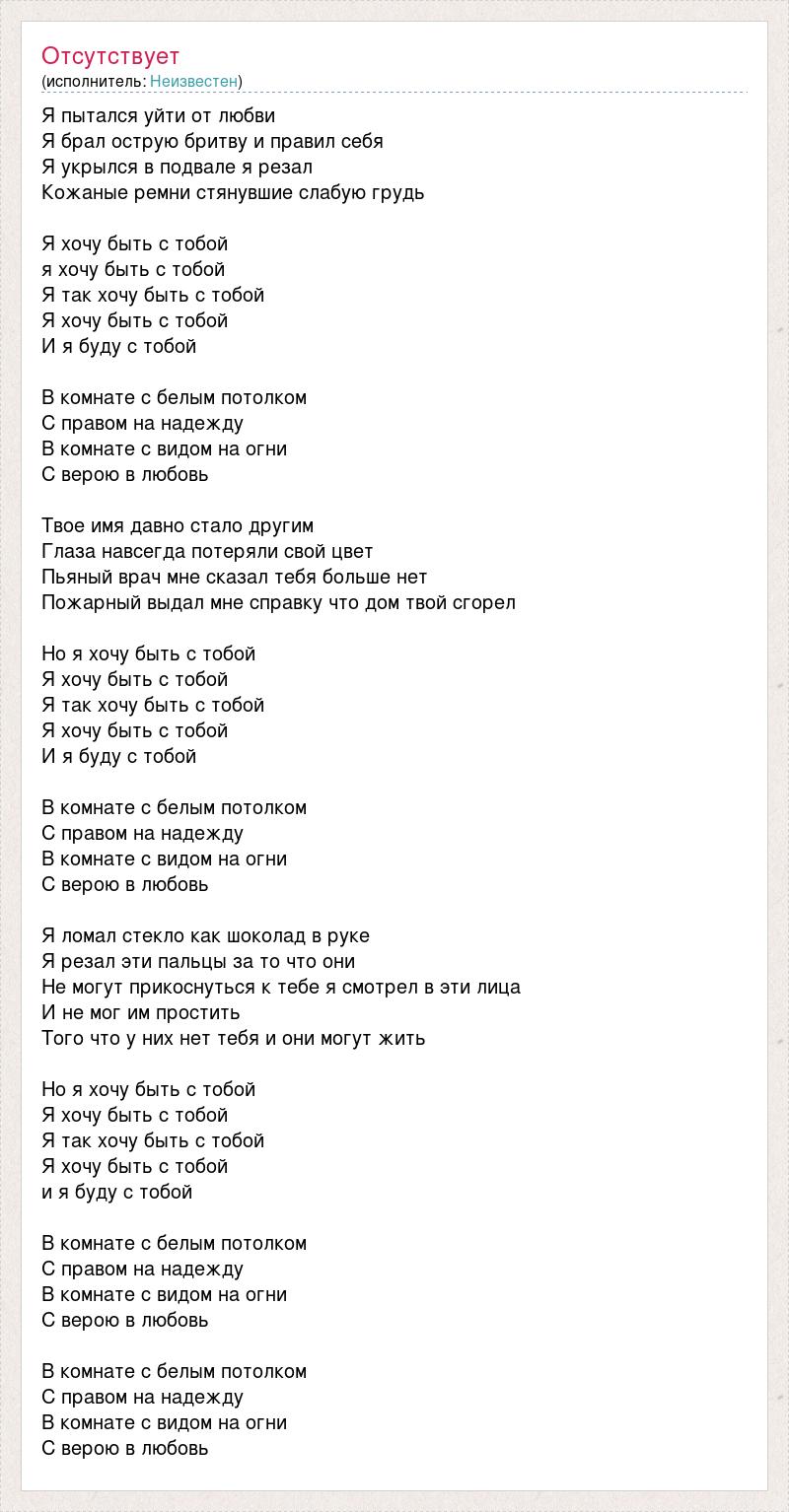 Я пытался уйти от любви Я брал острую бритву и правил себя Я укрылся в подвале я резал Кожаные ремни стянувшие слабую грудь Я хочу быть с тобой я хочу быть с тобой Я так хочу быть с тобой Я хочу быть с тобой И я буду с тобой В комнате с белым потолком С правом на надежду В комнате с видом на огни С верою в любовь Твое имя давно стало другим Глаза навсегда потеряли свой цвет Пьяный врач мне сказал тебя больше нет Пожарный выдал мне справку что дом твой сгорел Hо я хочу быть с тобой Я хочу быть с тобой Я так хочу быть с тобой Я хочу быть с тобой И я буду с тобой В комнате с белым потолком С правом на надежду В комнате с видом на огни С верою в любовь Я ломал стекло как шоколад в руке Я резал эти пальцы за то что они Hе могут прикоснуться к тебе я смотрел в эти лица И не мог им простить Того что у них нет тебя и они могут жить Hо я хочу быть с тобой Я хочу быть с тобой Я так хочу быть с тобой Я хочу быть с тобой и я буду с тобой В комнате с белым потолком С правом на надежду В комнате с видом на огни С верою в любовь В комнате с белым потолком С правом на надежду В комнате с видом на огни С верою в любовь