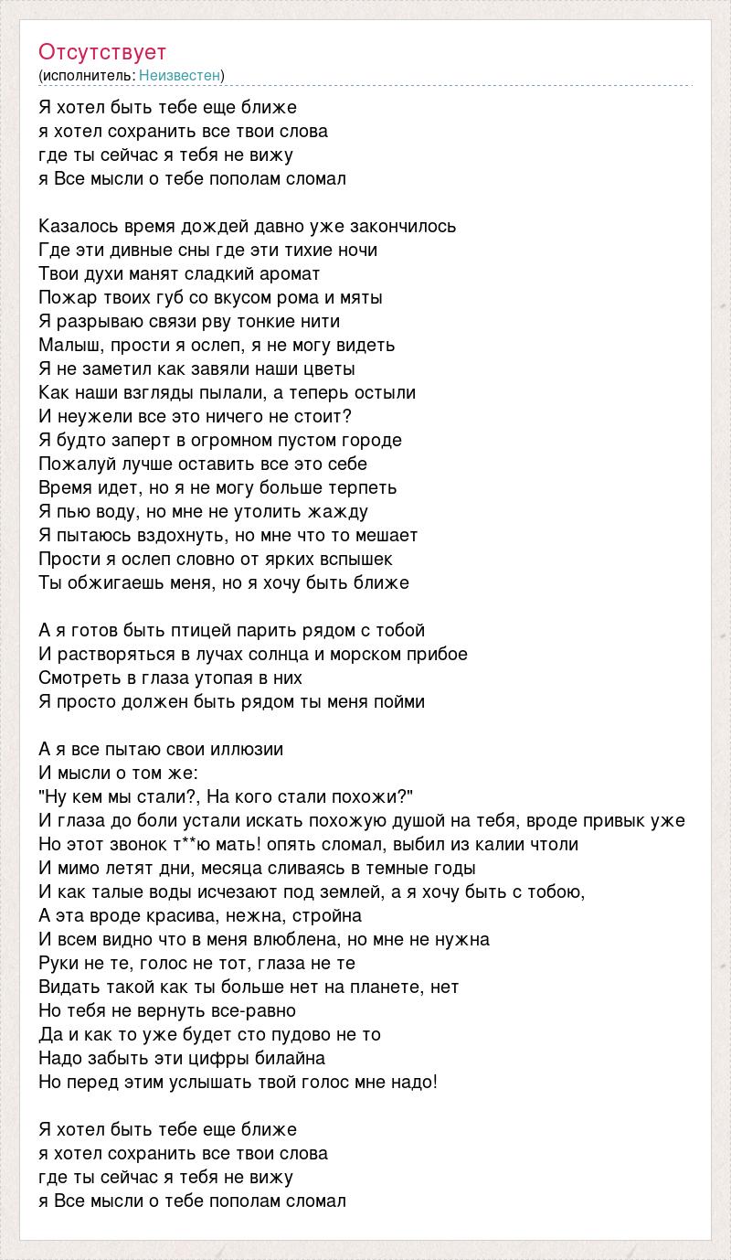 Я хотел быть тебе еще ближе я хотел сохранить все твои слова где ты сейчас я тебя не вижу я Все мысли о тебе пополам сломал Казалось время дождей давно уже закончилось Где эти дивные сны где эти тихие ночи Твои духи манят сладкий аромат Пожар твоих губ со вкусом рома и мяты Я разрываю связи рву тонкие нити Малыш, прости я ослеп, я не могу видеть Я не заметил как завяли наши цветы Как наши взгляды пылали, а теперь остыли И неужели все это ничего не стоит? Я будто заперт в огромном пустом городе Пожалуй лучше оставить все это себе Время идет, но я не могу больше терпеть Я пью воду, но мне не утолить жажду Я пытаюсь вздохнуть, но мне что то мешает Прости я ослеп словно от ярких вспышек Ты обжигаешь меня, но я хочу быть ближе А я готов быть птицей парить рядом с тобой И растворяться в лучах солнца и морском прибое Смотреть в глаза утопая в них Я просто должен быть рядом ты меня пойми А я все пытаю свои иллюзии И мысли о том же: "Ну кем мы стали?, На кого стали похожи?" И глаза до боли устали искать похожую душой на тебя, вроде привык уже Но этот звонок т**ю мать! опять сломал, выбил из калии чтоли И мимо летят дни, месяца сливаясь в темные годы И как талые воды исчезают под землей, а я хочу быть с тобою, А эта вроде красива, нежна, стройна И всем видно что в меня влюблена, но мне не нужна Руки не те, голос не тот, глаза не те Видать такой как ты больше нет на планете, нет Но тебя не вернуть все-равно Да и как то уже будет сто пудово не то Надо забыть эти цифры билайна Но перед этим услышать твой голос мне надо! Я хотел быть тебе еще ближе я хотел сохранить все твои слова где ты сейчас я тебя не вижу я Все мысли о тебе пополам сломал