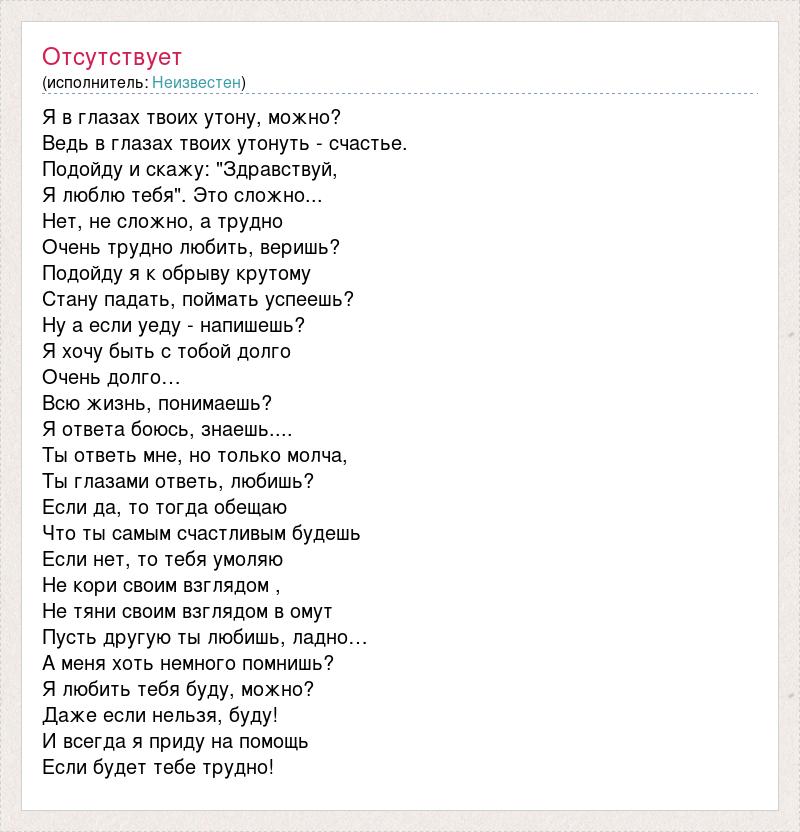 Я в глазах твоих утону, можно? Ведь в глазах твоих утонуть - счастье. Подойду и скажу: "Здравствуй, Я люблю тебя". Это сложно... Нет, не сложно, а трудно Очень трудно любить, веришь? Подойду я к обрыву крутому Стану падать, поймать успеешь? Ну а если уеду - напишешь? Я хочу быть с тобой долго Очень долго… Всю жизнь, понимаешь? Я ответа боюсь, знаешь.... Ты ответь мне, но только молча, Ты глазами ответь, любишь? Если да, то тогда обещаю Что ты самым счастливым будешь Если нет, то тебя умоляю Не кори своим взглядом , Не тяни своим взглядом в омут Пусть другую ты любишь, ладно… А меня хоть немного помнишь? Я любить тебя буду, можно? Даже если нельзя, буду! И всегда я приду на помощь Если будет тебе трудно!