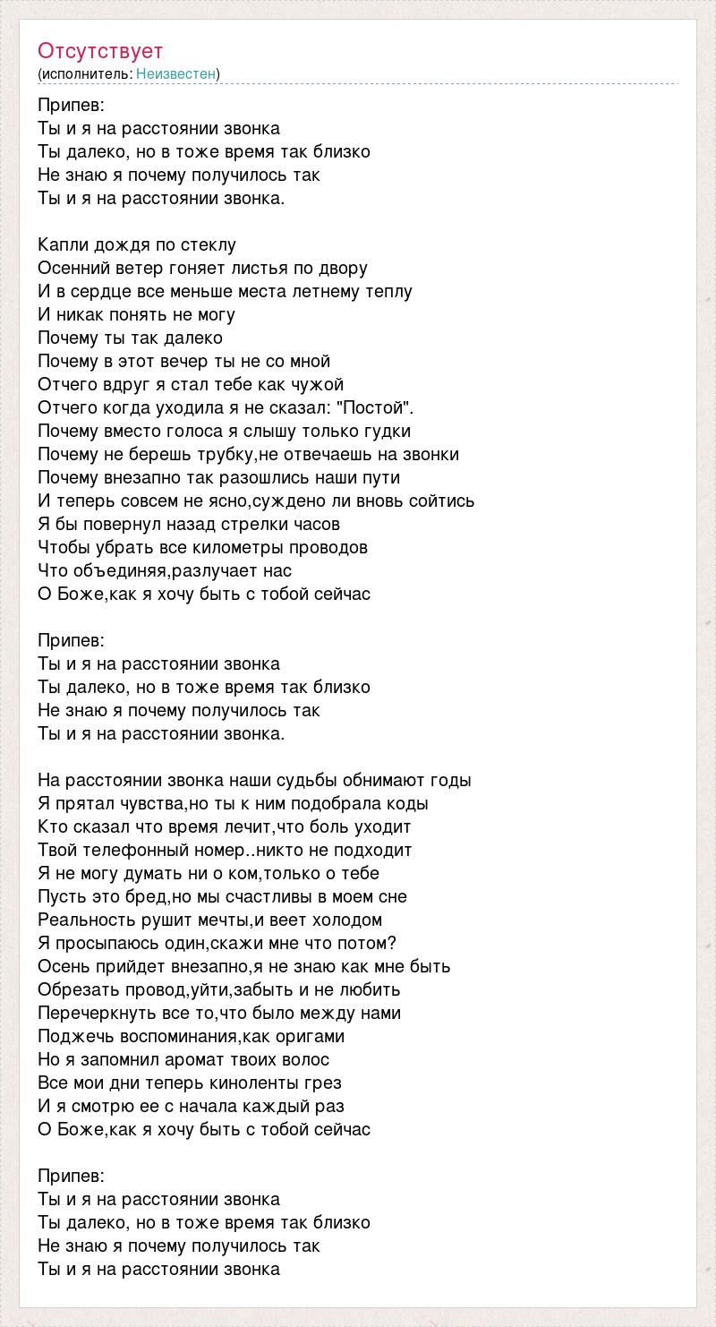 Припев: Ты и я на расстоянии звонка Ты далеко, но в тоже время так близко Не знаю я почему получилось так Ты и я на расстоянии звонка. Капли дождя по стеклу Осенний ветер гоняет листья по двору И в сердце все меньше места летнему теплу И никак понять не могу Почему ты так далеко Почему в этот вечер ты не со мной Отчего вдруг я стал тебе как чужой Отчего когда уходила я не сказал: "Постой". Почему вместо голоса я слышу только гудки Почему не берешь трубку,не отвечаешь на звонки Почему внезапно так разошлись наши пути И теперь совсем не ясно,суждено ли вновь сойтись Я бы повернул назад стрелки часов Чтобы убрать все километры проводов Что объединяя,разлучает нас О Боже,как я хочу быть с тобой сейчас Припев: Ты и я на расстоянии звонка Ты далеко, но в тоже время так близко Не знаю я почему получилось так Ты и я на расстоянии звонка. На расстоянии звонка наши судьбы обнимают годы Я прятал чувства,но ты к ним подобрала коды Кто сказал что время лечит,что боль уходит Твой телефонный номер..никто не подходит Я не могу думать ни о ком,только о тебе Пусть это бред,но мы счастливы в моем сне Реальность рушит мечты,и веет холодом Я просыпаюсь один,скажи мне что потом? Осень прийдет внезапно,я не знаю как мне быть Обрезать провод,уйти,забыть и не любить Перечеркнуть все то,что было между нами Поджечь воспоминания,как оригами Но я запомнил аромат твоих волос Все мои дни теперь киноленты грез И я смотрю ее с начала каждый раз О Боже,как я хочу быть с тобой сейчас Припев: Ты и я на расстоянии звонка Ты далеко, но в тоже время так близко Не знаю я почему получилось так Ты и я на расстоянии звонка