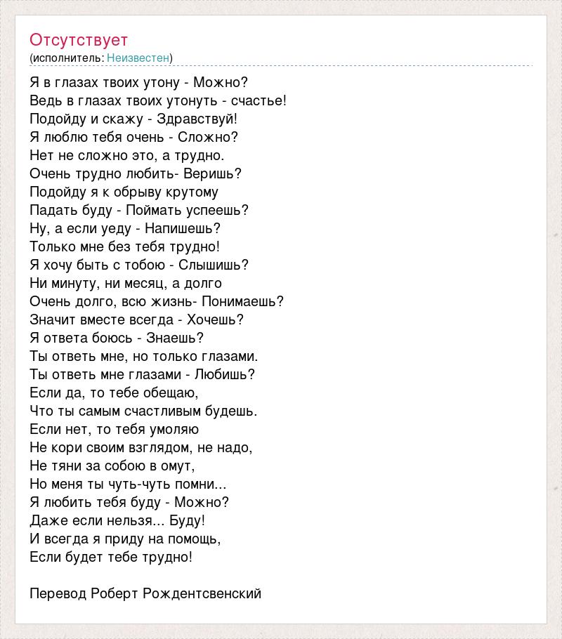 Я в глазах твоих утону - Можно? Ведь в глазах твоих утонуть - счастье! Подойду и скажу - Здравствуй! Я люблю тебя очень - Сложно? Нет не сложно это, а трудно. Очень трудно любить- Веришь? Подойду я к обрыву крутому Падать буду - Поймать успеешь? Ну, а если уеду - Напишешь? Только мне без тебя трудно! Я хочу быть с тобою - Слышишь? Ни минуту, ни месяц, а долго Очень долго, всю жизнь- Понимаешь? Значит вместе всегда - Хочешь? Я ответа боюсь - Знаешь? Ты ответь мне, но только глазами. Ты ответь мне глазами - Любишь? Если да, то тебе обещаю, Что ты самым счастливым будешь. Если нет, то тебя умоляю Не кори своим взглядом, не надо, Не тяни за собою в омут, Но меня ты чуть-чуть помни... Я любить тебя буду - Можно? Даже если нельзя... Буду! И всегда я приду на помощь, Если будет тебе трудно! Перевод Роберт Рождентсвенский