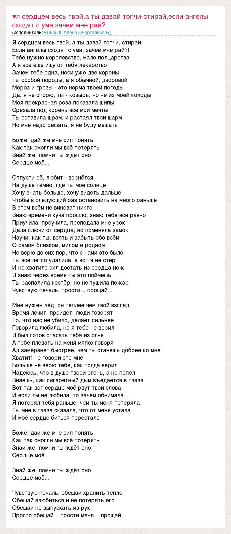 Я сердцем весь твой, а ты давай топчи, стирай Если ангелы сходят с ума, зачем мне рай?! Тебе нужно королевство, мало полцарства А я всё ещё ищу от тебя лекарство Зачем тебе одна, носи уже две короны Ты особой породы, а я обычной, дворовой Мороз и грозы - это норма твоей погоды Да, я не спорю, ты - козырь, но не из моей колоды Моя прекрасная роза показала шипы Срезала под корень все мои мечты Ты оставила шрам, и растаял твой шарм Но мне надо решать, я не буду мешать Боже! дай же мне сил понять Как так смогли мы всё потерять Знай же, помни ты ждёт оно Сердце моё... Отпусти её, любит - вернётся На душе темно, где ты моё солнце Хочу знать больше, хочу видеть дальше Чтобы в следующий раз остановить на много раньше В этом всём не виноват никто Знаю времени куча прошло, знаю тебе всё равно Приучила, проучила, преподала мне урок Дала ключи от сердца, но поменяла замок Научи, как ты, взять и забыть обо всём О самом близком, милом и родном Не верю до сих пор, что с нами это было Ты всё легко удалила, а вот я не стёр И не хватило сил достать из сердца нож Я знаю через время ты это поймешь Ты распалила костёр, но не тушила пожар Чувствую печаль, прости... прощай... Мне нужен лёд, он теплее чем твой взгляд Время лечит, пройдет, люди говорят То, что нас не убило, делает сильнее Говорила любила, но я тебе не верил Я был готов спасать тебя из огня А тебе плевать на меня мягко говоря Ад замёрзнет быстрее, чем ты станешь добрее ко мне Хватит! не говори это мне Больше не верю тебе, как тогда верил Надеюсь, что в душе твоей огонь, а не пепел Знаешь, как сигаретный дым въедается в глаза Вот так вот сердце моё рвут твои слова И если ты не любила, то зачем обнимала Я потерял тебя раньше, чем ты меня потеряла Ты мне в глаза сказала, что от меня устала И моё сердце биться перестало Боже! дай же мне сил понять Как так смогли мы всё потерять Знай же, помни ты ждёт оно Сердце моё... Знай же, помни ты ждёт оно Сердце моё... Чувствую печаль, обещай хранить тепло Обещай влюбиться и не потерять его Обещай не выпускать из рук Просто обещай... прости меня... прощай...