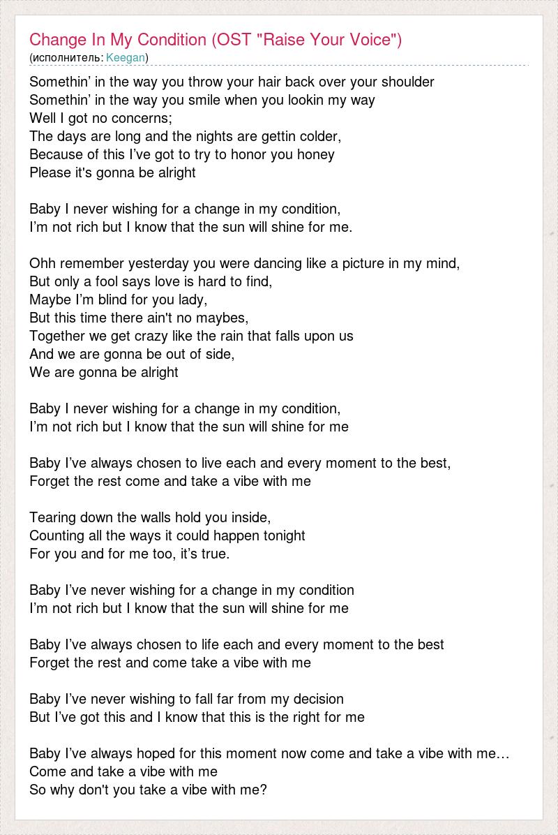 Somethin’ in the way you throw your hair back over your shoulder Somethin’ in the way you smile when you lookin my way Well I got no concerns; The days are long and the nights are gettin colder, Because of this I’ve got to try to honor you honey Please it's gonna be alright Baby I never wishing for a change in my condition, I’m not rich but I know that the sun will shine for me. Ohh remember yesterday you were dancing like a picture in my mind, But only a fool says love is hard to find, Maybe I’m blind for you lady, But this time there ain't no maybes, Together we get crazy like the rain that falls upon us And we are gonna be out of side, We are gonna be alright Baby I never wishing for a change in my condition, I’m not rich but I know that the sun will shine for me Baby I’ve always chosen to live each and every moment to the best, Forget the rest come and take a vibe with me Tearing down the walls hold you inside, Counting all the ways it could happen tonight For you and for me too, it’s true. Baby I’ve never wishing for a change in my condition I’m not rich but I know that the sun will shine for me Baby I’ve always chosen to life each and every moment to the best Forget the rest and come take a vibe with me Baby I’ve never wishing to fall far from my decision But I’ve got this and I know that this is the right for me Baby I’ve always hoped for this moment now come and take a vibe with me… Come and take a vibe with me So why don't you take a vibe with me?