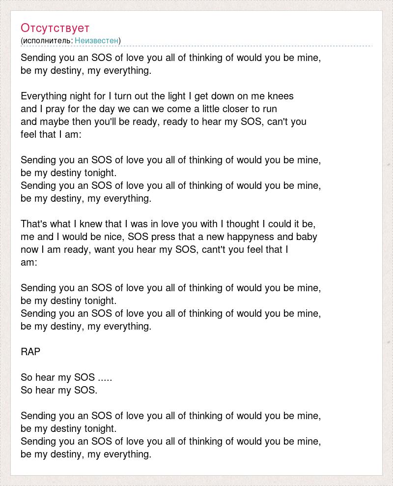 Sending you an SOS of love you all of thinking of would you be mine, be my destiny, my everything. Everything night for I turn out the light I get down on me knees and I pray for the day we can we come a little closer to run and maybe then you'll be ready, ready to hear my SOS, can't you feel that I am: Sending you an SOS of love you all of thinking of would you be mine, be my destiny tonight. Sending you an SOS of love you all of thinking of would you be mine, be my destiny, my everything. That's what I knew that I was in love you with I thought I could it be, me and I would be nice, SOS press that a new happyness and baby now I am ready, want you hear my SOS, cant't you feel that I am: Sending you an SOS of love you all of thinking of would you be mine, be my destiny tonight. Sending you an SOS of love you all of thinking of would you be mine, be my destiny, my everything. RAP So hear my SOS ..... So hear my SOS. Sending you an SOS of love you all of thinking of would you be mine, be my destiny tonight. Sending you an SOS of love you all of thinking of would you be mine, be my destiny, my everything.