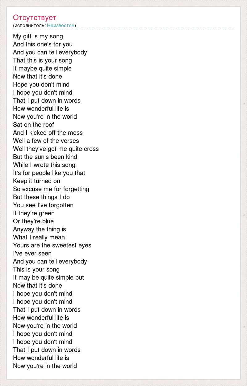 My gift is my song And this one's for you And you can tell everybody That this is your song It maybe quite simple Now that it's done Hope you don't mind I hope you don't mind That I put down in words How wonderful life is Now you're in the world Sat on the roof And I kicked off the moss Well a few of the verses Well they've got me quite cross But the sun's been kind While I wrote this song It's for people like you that Keep it turned on So excuse me for forgetting But these things I do You see I've forgotten If they're green Or they're blue Anyway the thing is What I really mean Yours are the sweetest eyes I've ever seen And you can tell everybody This is your song It may be quite simple but Now that it's done I hope you don't mind I hope you don't mind That I put down in words How wonderful life is Now you're in the world I hope you don't mind I hope you don't mind That I put down in words How wonderful life is Now you're in the world