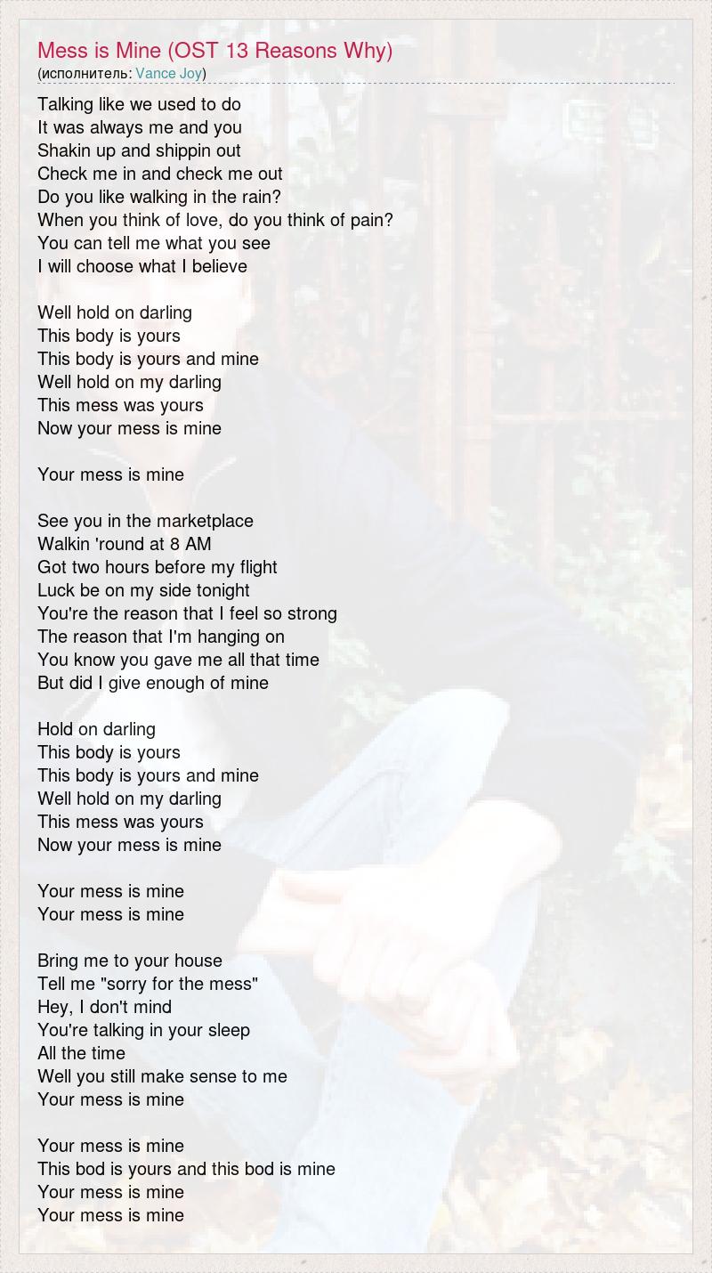 Talking like we used to do It was always me and you Shakin up and shippin out Check me in and check me out Do you like walking in the rain? When you think of love, do you think of pain? You can tell me what you see I will choose what I believe Well hold on darling This body is yours This body is yours and mine Well hold on my darling This mess was yours Now your mess is mine Your mess is mine See you in the marketplace Walkin 'round at 8 AM Got two hours before my flight Luck be on my side tonight You're the reason that I feel so strong The reason that I'm hanging on You know you gave me all that time But did I give enough of mine Hold on darling This body is yours This body is yours and mine Well hold on my darling This mess was yours Now your mess is mine Your mess is mine Your mess is mine Bring me to your house Tell me "sorry for the mess" Hey, I don't mind You're talking in your sleep All the time Well you still make sense to me Your mess is mine Your mess is mine This bod is yours and this bod is mine Your mess is mine Your mess is mine