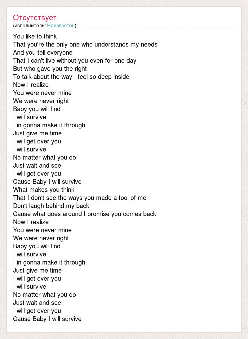 You like to think That you're the only one who understands my needs And you tell everyone That I can't live without you even for one day But who gave you the right To talk about the way I feel so deep inside Now I realize You were never mine We were never right Baby you will find I will survive I in gonna make it through Just give me time I will get over you I will survive No matter what you do Just wait and see I will get over you Cause Baby I will survive What makes you think That I don't see the ways you made a fool of me Don't laugh behind my back Cause what goes around I promise you comes back Now I realize You were never mine We were never right Baby you will find I will survive I in gonna make it through Just give me time I will get over you I will survive No matter what you do Just wait and see I will get over you Cause Baby I will survive