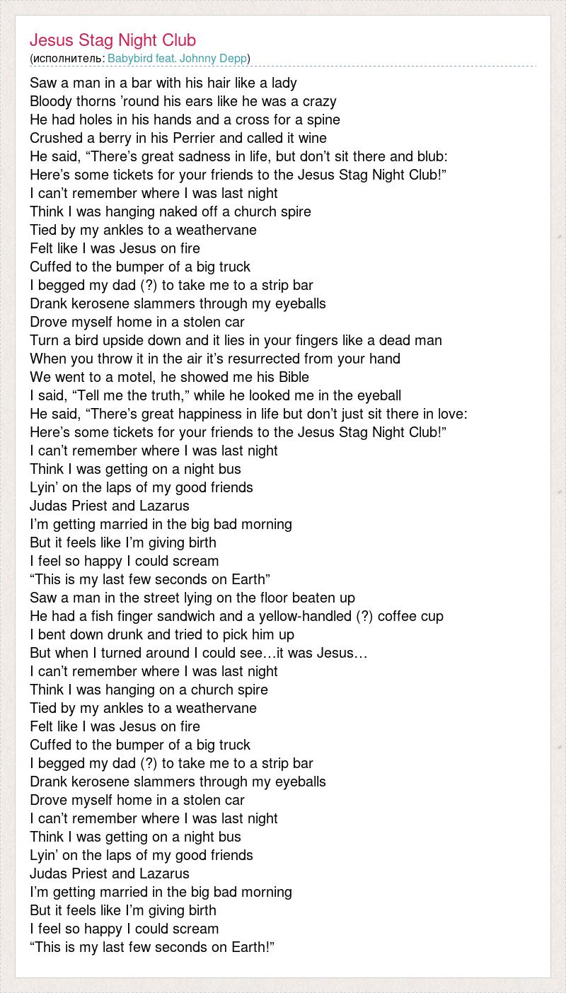 Saw a man in a bar with his hair like a lady Bloody thorns ’round his ears like he was a crazy He had holes in his hands and a cross for a spine Crushed a berry in his Perrier and called it wine He said, “There’s great sadness in life, but don’t sit there and blub: Here’s some tickets for your friends to the Jesus Stag Night Club!” I can’t remember where I was last night Think I was hanging naked off a church spire Tied by my ankles to a weathervane Felt like I was Jesus on fire Cuffed to the bumper of a big truck I begged my dad (?) to take me to a strip bar Drank kerosene slammers through my eyeballs Drove myself home in a stolen car Turn a bird upside down and it lies in your fingers like a dead man When you throw it in the air it’s resurrected from your hand We went to a motel, he showed me his Bible I said, “Tell me the truth,” while he looked me in the eyeball He said, “There’s great happiness in life but don’t just sit there in love: Here’s some tickets for your friends to the Jesus Stag Night Club!” I can’t remember where I was last night Think I was getting on a night bus Lyin’ on the laps of my good friends Judas Priest and Lazarus I’m getting married in the big bad morning But it feels like I’m giving birth I feel so happy I could scream “This is my last few seconds on Earth” Saw a man in the street lying on the floor beaten up He had a fish finger sandwich and a yellow-handled (?) coffee cup I bent down drunk and tried to pick him up But when I turned around I could see…it was Jesus… I can’t remember where I was last night Think I was hanging on a church spire Tied by my ankles to a weathervane Felt like I was Jesus on fire Cuffed to the bumper of a big truck I begged my dad (?) to take me to a strip bar Drank kerosene slammers through my eyeballs Drove myself home in a stolen car I can’t remember where I was last night Think I was getting on a night bus Lyin’ on the laps of my good friends Judas Priest and Lazarus I’m getting married in the big bad morning But it feels like I’m giving birth I feel so happy I could scream “This is my last few seconds on Earth!”