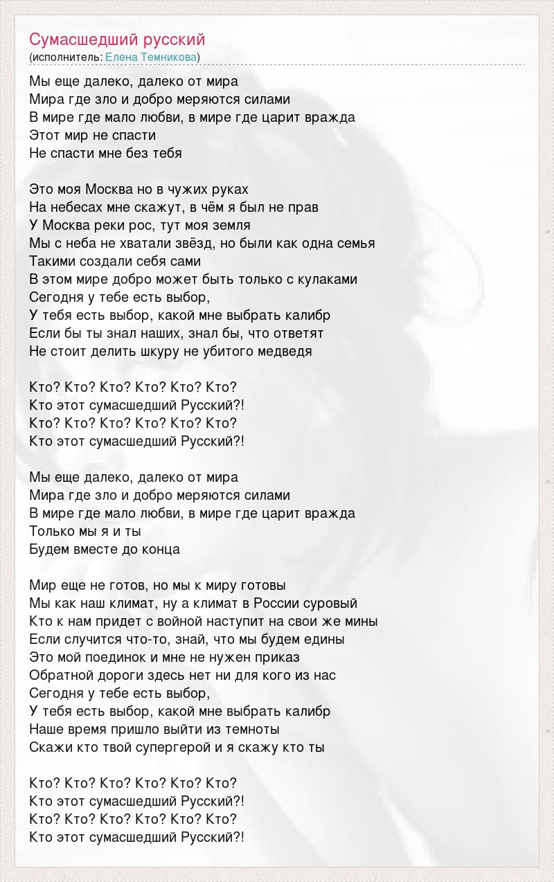 Мы еще далеко, далеко от мира Мира где зло и добро меряются силами В мире где мало любви, в мире где царит вражда Этот мир не спасти Не спасти мне без тебя Это моя Москва но в чужих руках На небесах мне скажут, в чём я был не прав У Москва реки рос, тут моя земля Мы с неба не хватали звёзд, но были как одна семья Такими создали себя сами В этом мире добро может быть только с кулаками Сегодня у тебе есть выбор, У тебя есть выбор, какой мне выбрать калибр Если бы ты знал наших, знал бы, что ответят Не стоит делить шкуру не убитого медведя Кто? Кто? Кто? Кто? Кто? Кто? Кто этот сумасшедший Русский?! Кто? Кто? Кто? Кто? Кто? Кто? Кто этот сумасшедший Русский?! Мы еще далеко, далеко от мира Мира где зло и добро меряются силами В мире где мало любви, в мире где царит вражда Только мы я и ты Будем вместе до конца Мир еще не готов, но мы к миру готовы Мы как наш климат, ну а климат в России суровый Кто к нам придет с войной наступит на свои же мины Если случится что-то, знай, что мы будем едины Это мой поединок и мне не нужен приказ Обратной дороги здесь нет ни для кого из нас Сегодня у тебе есть выбор, У тебя есть выбор, какой мне выбрать калибр Наше время пришло выйти из темноты Скажи кто твой супергерой и я скажу кто ты Кто? Кто? Кто? Кто? Кто? Кто? Кто этот сумасшедший Русский?! Кто? Кто? Кто? Кто? Кто? Кто? Кто этот сумасшедший Русский?!