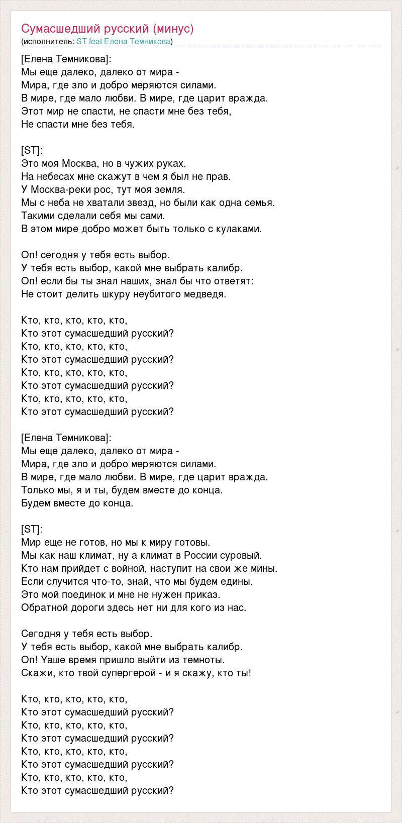 [Елена Темникова]: Мы еще далеко, далеко от мира - Мира, где зло и добро меряются силами. В мире, где мало любви. В мире, где царит вражда. Этот мир не спасти, не спасти мне без тебя, Не спасти мне без тебя. [ST]: Это моя Москва, но в чужих руках. На небесах мне скажут в чем я был не прав. У Москва-реки рос, тут моя земля. Мы с неба не хватали звезд, но были как одна семья. Такими сделали себя мы сами. В этом мире добро может быть только с кулаками. Оп! сегодня у тебя есть выбор. У тебя есть выбор, какой мне выбрать калибр. Оп! если бы ты знал наших, знал бы что ответят: Не стоит делить шкуру неубитого медведя. Кто, кто, кто, кто, кто, Кто этот сумасшедший русский? Кто, кто, кто, кто, кто, Кто этот сумасшедший русский? Кто, кто, кто, кто, кто, Кто этот сумасшедший русский? Кто, кто, кто, кто, кто, Кто этот сумасшедший русский? [Елена Темникова]: Мы еще далеко, далеко от мира - Мира, где зло и добро меряются силами. В мире, где мало любви. В мире, где царит вражда. Только мы, я и ты, будем вместе до конца. Будем вместе до конца. [ST]: Мир еще не готов, но мы к миру готовы. Мы как наш климат, ну а климат в России суровый. Кто нам прийдет с войной, наступит на свои же мины. Если случится что-то, знай, что мы будем едины. Это мой поединок и мне не нужен приказ. Обратной дороги здесь нет ни для кого из нас. Сегодня у тебя есть выбор. У тебя есть выбор, какой мне выбрать калибр. Оп! Yаше время пришло выйти из темноты. Скажи, кто твой супергерой - и я скажу, кто ты! Кто, кто, кто, кто, кто, Кто этот сумасшедший русский? Кто, кто, кто, кто, кто, Кто этот сумасшедший русский? Кто, кто, кто, кто, кто, Кто этот сумасшедший русский? Кто, кто, кто, кто, кто, Кто этот сумасшедший русский?
