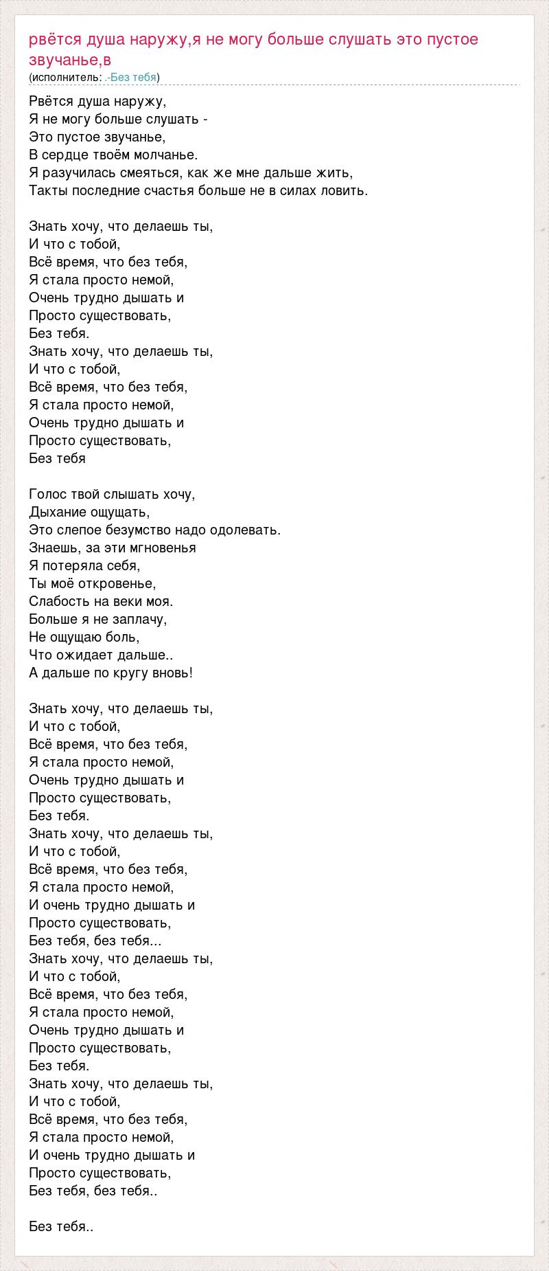 Рвётся душа наружу, Я не могу больше слушать - Это пустое звучанье, В сердце твоём молчанье. Я разучилась смеяться, как же мне дальше жить, Такты последние счастья больше не в силах ловить. Знать хочу, что делаешь ты, И что с тобой, Всё время, что без тебя, Я стала просто немой, Очень трудно дышать и Просто существовать, Без тебя. Знать хочу, что делаешь ты, И что с тобой, Всё время, что без тебя, Я стала просто немой, Очень трудно дышать и Просто существовать, Без тебя Голос твой слышать хочу, Дыхание ощущать, Это слепое безумство надо одолевать. Знаешь, за эти мгновенья Я потеряла себя, Ты моё откровенье, Слабость на веки моя. Больше я не заплачу, Не ощущаю боль, Что ожидает дальше.. А дальше по кругу вновь! Знать хочу, что делаешь ты, И что с тобой, Всё время, что без тебя, Я стала просто немой, Очень трудно дышать и Просто существовать, Без тебя. Знать хочу, что делаешь ты, И что с тобой, Всё время, что без тебя, Я стала просто немой, И очень трудно дышать и Просто существовать, Без тебя, без тебя... Знать хочу, что делаешь ты, И что с тобой, Всё время, что без тебя, Я стала просто немой, Очень трудно дышать и Просто существовать, Без тебя. Знать хочу, что делаешь ты, И что с тобой, Всё время, что без тебя, Я стала просто немой, И очень трудно дышать и Просто существовать, Без тебя, без тебя.. Без тебя..