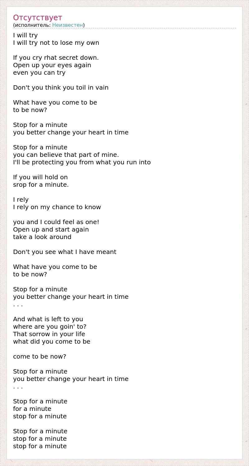 I will try I will try not to lose my own If you cry rhat secret down. Open up your eyes again even you can try Don't you think you toil in vain What have you come to be to be now? Stop for a minute you better change your heart in time Stop for a minute you can believe that part of mine. I'll be protecting you from what you run into If you will hold on srop for a minute. I rely I rely on my chance to know you and I could feel as one! Open up and start again take a look around Don't you see what I have meant What have you come to be to be now? Stop for a minute you better change your heart in time . . . And what is left to you where are you goin' to? That sorrow in your life what did you come to be come to be now? Stop for a minute you better change your heart in time . . . Stop for a minute for a minute stop for a minute Stop for a minute stop for a minute stop for a minute