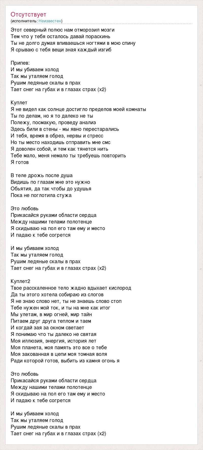 Этот северный полюс нам отморозил мозги Тем что у тебя осталось давай пораскинь Ты не долго думая впиваешься ногтями в мою спину Я срываю с тебя вещи зная каждый изгиб Припев: И мы убиваем холод Так мы уталяем голод Рушим ледяные скалы в прах Тает снег на губах и в глазах страх (х2) Куплет Я не видел как солнце достигло пределов моей комнаты Ты по делам, но я то далеко не ты Полежу, посмакую, проведу анализ Здесь били в стены - мы явно перестарались И тебя, время в обрез, нервы и стресс Но ты место находишь отправить мне смс Я доволен собой, и тем как тянется нить Тебе мало, меня немало ты требуешь повторить Я готов В теле дрожь после душа Видишь по глазам мне это нужно Обьятия, да так чтобы до удушья Пока не поглотила стужа Это любовь Прикасайся руками области сердца Между нашими телами полотенце Я скидываю на пол его там ему и место И падаю к тебе согрется И мы убиваем холод Так мы уталяем голод Рушим ледяные скалы в прах Тает снег на губах и в глазах страх (х2) Куплет2 Твое расскаленное тело жадно вдыхает кислород Да ты этого хотела собираю из слогов Я не знаю слово нет, ты не знаешь слово стоп Тебе нужен мой ток, и ты на мне как итог Мы улетам, в мир огней, мир тайн Питаем друг друга теплом и таем И когдай зая за окном светает Я понимаю что ты далеко не святая Моя иллюзия, энергия, история лет Моя планета, моя память это все о тебе Моя закованная в цепи моя томная воля Ради которой готов, выбить из камня огонь я Это любовь Прикасайся руками области сердца Между нашими телами полотенце Я скидываю на пол его там ему и место И падаю к тебе согрется И мы убиваем холод Так мы уталяем голод Рушим ледяные скалы в прах Тает снег на губах и в глазах страх (х2)