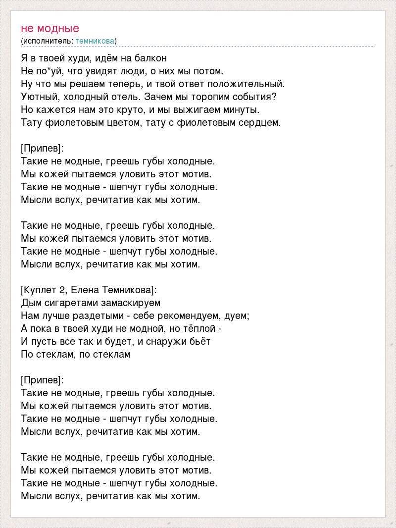 Я в твоей худи, идём на балкон Не по*уй, что увидят люди, о них мы потом. Ну что мы решаем теперь, и твой ответ положительный. Уютный, холодный отель. Зачем мы торопим события? Но кажется нам это круто, и мы выжигаем минуты. Тату фиолетовым цветом, тату с фиолетовым сердцем. [Припев]: Такие не модные, греешь губы холодные. Мы кожей пытаемся уловить этот мотив. Такие не модные - шепчут губы холодные. Мысли вслух, речитатив как мы хотим. Такие не модные, греешь губы холодные. Мы кожей пытаемся уловить этот мотив. Такие не модные - шепчут губы холодные. Мысли вслух, речитатив как мы хотим. [Куплет 2, Елена Темникова]: Дым сигаретами замаскируем Нам лучше раздетыми - себе рекомендуем, дуем; А пока в твоей худи не модной, но тёплой - И пусть все так и будет, и снаружи бьёт По стеклам, по стеклам [Припев]: Такие не модные, греешь губы холодные. Мы кожей пытаемся уловить этот мотив. Такие не модные - шепчут губы холодные. Мысли вслух, речитатив как мы хотим. Такие не модные, греешь губы холодные. Мы кожей пытаемся уловить этот мотив. Такие не модные - шепчут губы холодные. Мысли вслух, речитатив как мы хотим.