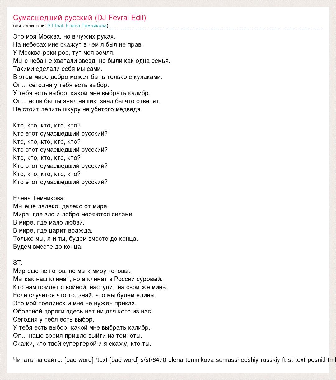 Это моя Москва, но в чужих руках. На небесах мне скажут в чем я был не прав. У Москва-реки рос, тут моя земля. Мы с неба не хватали звезд, но были как одна семья. Такими сделали себя мы сами. В этом мире добро может быть только с кулаками. Оп... сегодня у тебя есть выбор. У тебя есть выбор, какой мне выбрать калибр. Оп... если бы ты знал наших, знал бы что ответят. Не стоит делить шкуру не убитого медведя. Кто, кто, кто, кто, кто? Кто этот сумасшедший русский? Кто, кто, кто, кто, кто? Кто этот сумасшедший русский? Кто, кто, кто, кто, кто? Кто этот сумасшедший русский? Кто, кто, кто, кто, кто? Кто этот сумасшедший русский? Елена Темникова: Мы еще далеко, далеко от мира. Мира, где зло и добро меряются силами. В мире, где мало любви. В мире, где царит вражда. Только мы, я и ты, будем вместе до конца. Будем вместе до конца. ST: Мир еще не готов, но мы к миру готовы. Мы как наш климат, но а климат в России суровый. Кто нам придет с войной, наступит на свои же мины. Если случится что то, знай, что мы будем едины. Это мой поединок и мне не нужен приказ. Обратной дороги здесь нет ни для кого из нас. Сегодня у тебя есть выбор. У тебя есть выбор, какой мне выбрать калибр. Оп... наше время пришло выйти из темноты. Скажи, кто твой супергерой и я скажу, кто ты. Читать на сайте: [bad word] /text [bad word] s/st/6470-elena-temnikova-sumasshedshiy-russkiy-ft-st-text-pesni.html