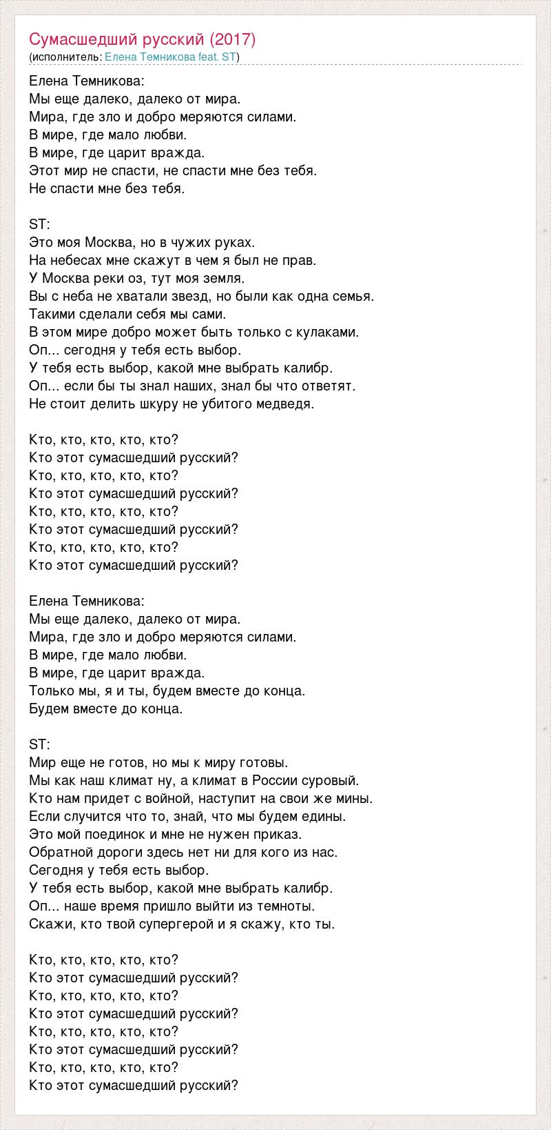 Елена Темникова: Мы еще далеко, далеко от мира. Мира, где зло и добро меряются силами. В мире, где мало любви. В мире, где царит вражда. Этот мир не спасти, не спасти мне без тебя. Не спасти мне без тебя. ST: Это моя Москва, но в чужих руках. На небесах мне скажут в чем я был не прав. У Москва реки оз, тут моя земля. Вы с неба не хватали звезд, но были как одна семья. Такими сделали себя мы сами. В этом мире добро может быть только с кулаками. Оп... сегодня у тебя есть выбор. У тебя есть выбор, какой мне выбрать калибр. Оп... если бы ты знал наших, знал бы что ответят. Не стоит делить шкуру не убитого медведя. Кто, кто, кто, кто, кто? Кто этот сумасшедший русский? Кто, кто, кто, кто, кто? Кто этот сумасшедший русский? Кто, кто, кто, кто, кто? Кто этот сумасшедший русский? Кто, кто, кто, кто, кто? Кто этот сумасшедший русский? Елена Темникова: Мы еще далеко, далеко от мира. Мира, где зло и добро меряются силами. В мире, где мало любви. В мире, где царит вражда. Только мы, я и ты, будем вместе до конца. Будем вместе до конца. ST: Мир еще не готов, но мы к миру готовы. Мы как наш климат ну, а климат в России суровый. Кто нам придет с войной, наступит на свои же мины. Если случится что то, знай, что мы будем едины. Это мой поединок и мне не нужен приказ. Обратной дороги здесь нет ни для кого из нас. Сегодня у тебя есть выбор. У тебя есть выбор, какой мне выбрать калибр. Оп... наше время пришло выйти из темноты. Скажи, кто твой супергерой и я скажу, кто ты. Кто, кто, кто, кто, кто? Кто этот сумасшедший русский? Кто, кто, кто, кто, кто? Кто этот сумасшедший русский? Кто, кто, кто, кто, кто? Кто этот сумасшедший русский? Кто, кто, кто, кто, кто? Кто этот сумасшедший русский?