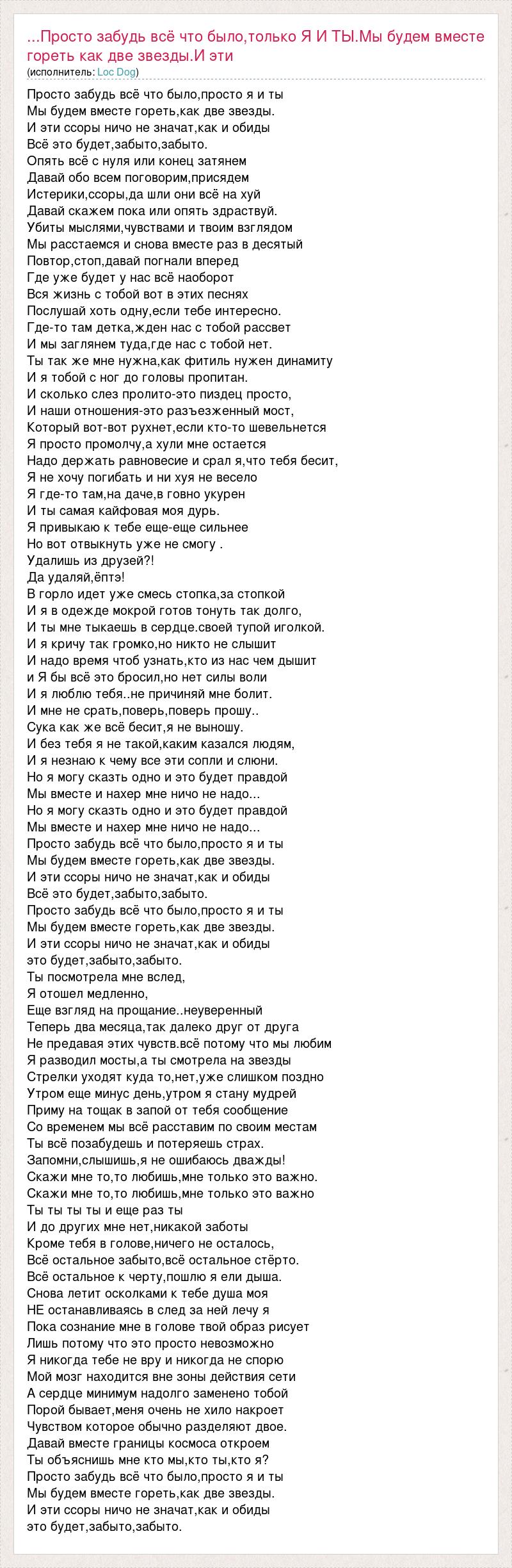 Просто забудь всё что было,просто я и ты Мы будем вместе гореть,как две звезды. И эти ссоры ничо не значат,как и обиды Всё это будет,забыто,забыто. Опять всё с нуля или конец затянем Давай обо всем поговорим,присядем Истерики,ссоры,да шли они всё на хуй Давай скажем пока или опять здраствуй. Убиты мыслями,чувствами и твоим взглядом Мы расстаемся и снова вместе раз в десятый Повтор,стоп,давай погнали вперед Где уже будет у нас всё наоборот Вся жизнь с тобой вот в этих песнях Послушай хоть одну,если тебе интересно. Где-то там детка,жден нас с тобой рассвет И мы заглянем туда,где нас с тобой нет. Ты так же мне нужна,как фитиль нужен динамиту И я тобой с ног до головы пропитан. И сколько слез пролито-это пиздец просто, И наши отношения-это разъезженный мост, Который вот-вот рухнет,если кто-то шевельнется Я просто промолчу,а хули мне остается Надо держать равновесие и срал я,что тебя бесит, Я не хочу погибать и ни хуя не весело Я где-то там,на даче,в говно укурен И ты самая кайфовая моя дурь. Я привыкаю к тебе еще-еще сильнее Но вот отвыкнуть уже не смогу . Удалишь из друзей?! Да удаляй,ёптэ! В горло идет уже смесь стопка,за стопкой И я в одежде мокрой готов тонуть так долго, И ты мне тыкаешь в сердце.своей тупой иголкой. И я кричу так громко,но никто не слышит И надо время чтоб узнать,кто из нас чем дышит и Я бы всё это бросил,но нет силы воли И я люблю тебя..не причиняй мне болит. И мне не срать,поверь,поверь прошу.. Сука как же всё бесит,я не выношу. И без тебя я не такой,каким казался людям, И я незнаю к чему все эти сопли и слюни. Но я могу сказть одно и это будет правдой Мы вместе и нахер мне ничо не надо... Но я могу сказть одно и это будет правдой Мы вместе и нахер мне ничо не надо... Просто забудь всё что было,просто я и ты Мы будем вместе гореть,как две звезды. И эти ссоры ничо не значат,как и обиды Всё это будет,забыто,забыто. Просто забудь всё что было,просто я и ты Мы будем вместе гореть,как две звезды. И эти ссоры ничо не значат,как и обиды это будет,забыто,забыто. Ты посмотрела мне вслед, Я отошел медленно, Еще взгляд на прощание..неуверенный Теперь два месяца,так далеко друг от друга Не предавая этих чувств.всё потому что мы любим Я разводил мосты,а ты смотрела на звезды Стрелки уходят куда то,нет,уже слишком поздно Утром еще минус день,утром я стану мудрей Приму на тощак в запой от тебя сообщение Со временем мы всё расставим по своим местам Ты всё позабудешь и потеряешь страх. Запомни,слышишь,я не ошибаюсь дважды! Скажи мне то,то любишь,мне только это важно. Скажи мне то,то любишь,мне только это важно Ты ты ты ты и еще раз ты И до других мне нет,никакой заботы Кроме тебя в голове,ничего не осталось, Всё остальное забыто,всё остальное стёрто. Всё остальное к черту,пошлю я ели дыша. Снова летит осколками к тебе душа моя НЕ останавливаясь в след за ней лечу я Пока сознание мне в голове твой образ рисует Лишь потому что это просто невозможно Я никогда тебе не вру и никогда не спорю Мой мозг находится вне зоны действия сети А сердце минимум надолго заменено тобой Порой бывает,меня очень не хило накроет Чувством которое обычно разделяют двое. Давай вместе границы космоса откроем Ты объяснишь мне кто мы,кто ты,кто я? Просто забудь всё что было,просто я и ты Мы будем вместе гореть,как две звезды. И эти ссоры ничо не значат,как и обиды это будет,забыто,забыто.