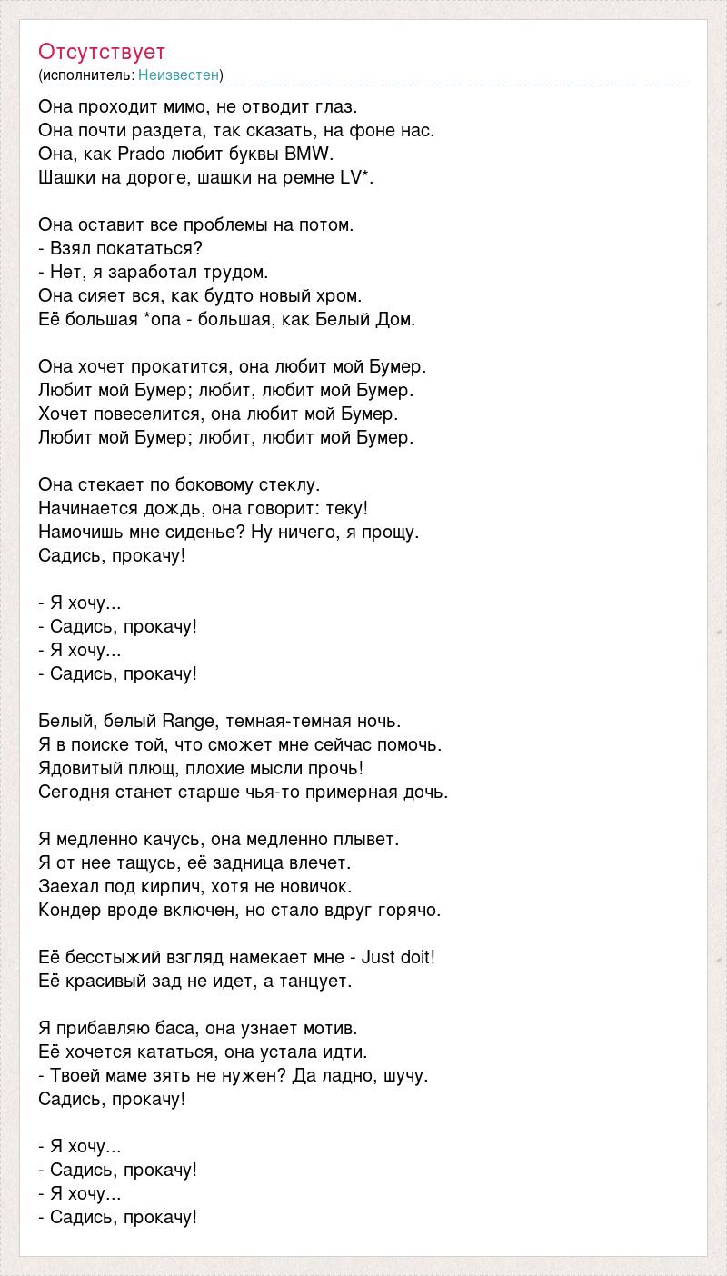 Она проходит мимо, не отводит глаз. Она почти раздета, так сказать, на фоне нас. Она, как Prado любит буквы BMW. Шашки на дороге, шашки на ремне LV*. Она оставит все проблемы на потом. - Взял покататься? - Нет, я заработал трудом. Она сияет вся, как будто новый хром. Её большая *опа - большая, как Белый Дом. Она хочет прокатится, она любит мой Бумер. Любит мой Бумер; любит, любит мой Бумер. Хочет повеселится, она любит мой Бумер. Любит мой Бумер; любит, любит мой Бумер. Она стекает по боковому стеклу. Начинается дождь, она говорит: теку! Намочишь мне сиденье? Ну ничего, я прощу. Садись, прокачу! - Я хочу... - Садись, прокачу! - Я хочу... - Садись, прокачу! Белый, белый Range, темная-темная ночь. Я в поиске той, что сможет мне сейчас помочь. Ядовитый плющ, плохие мысли прочь! Сегодня станет старше чья-то примерная дочь. Я медленно качусь, она медленно плывет. Я от нее тащусь, её задница влечет. Заехал под кирпич, хотя не новичок. Кондер вроде включен, но стало вдруг горячо. Её бесстыжий взгляд намекает мне - Just doit! Её красивый зад не идет, а танцует. Я прибавляю баса, она узнает мотив. Её хочется кататься, она устала идти. - Твоей маме зять не нужен? Да ладно, шучу. Садись, прокачу! - Я хочу... - Садись, прокачу! - Я хочу... - Садись, прокачу!