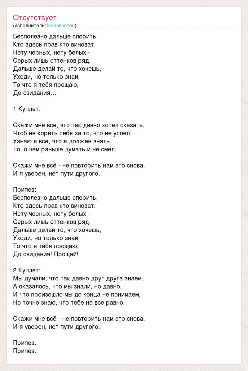 Бесполезно дальше спорить Кто здесь прав кто виноват. Нету черных, нету белых - Серых лишь оттенков ряд. Дальше делай то, что хочешь, Уходи, но только знай, То что я тебя прощаю, До свидания… 1 Куплет: Скажи мне все, что так давно хотел сказать, Чтоб не корить себя за то, что не успел. Узнаю я все, что я должен знать. То, о чем раньше думать и не смел. Скажи мне всё - не повторить нам это снова. И я уверен, нет пути другого. Припев: Бесполезно дальше спорить, Кто здесь прав кто виноват. Нету черных, нету белых - Серых лишь оттенков ряд. Дальше делай то, что хочешь, Уходи, но только знай, То что я тебя прощаю, До свидания! Прощай! 2 Куплет: Мы думали, что так давно друг друга знаем. А оказалось, что мы знали, но давно. И что произошло мы до конца не понимаем, Но точно знаю, что тебе не все равно. Скажи мне всё - не повторить нам это снова. И я уверен, нет пути другого. Припев. Припев.
