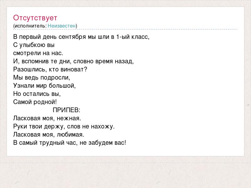 А как ты думаешь, о чем песня "В первый день сентября мы шли в 1-ый класс" ?