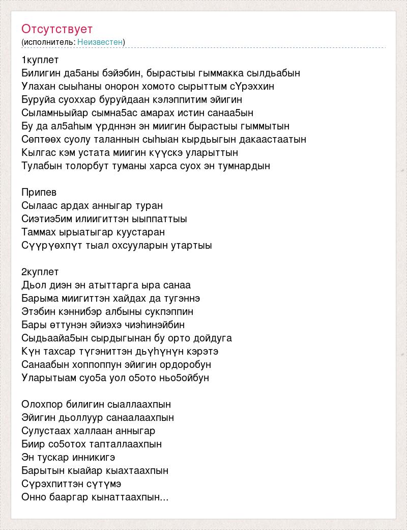 1куплет Билигин да5аны бэйэбин, бырастыы гыммакка сылдьабын Улахан сыыhаны онорон хомото сырыттым сYрэххин Буруйа суоххар буруйдаан кэлэппитим эйигин Сыламньыйар сымна5ас амарах истин санаа5ын Бу да ал5аhым үрдннэн эн миигин бырастыы гыммытын Сөптөөх суолу таланнын сыhыан кырдьыгын дакаастаатын Кылгас кэм устата миигин күүскэ уларыттын Тулабын толорбут туманы харса суох эн тумнардын Припев Сылаас ардах анныгар туран Сиэтиэ5им илиигиттэн ыыппаттыы Таммах ырыатыгар куустаран Сүүрүөхпүт тыал охсууларын утартыы 2куплет Дьол диэн эн атыттарга ыра санаа Барыма миигиттэн хайдах да тугэннэ Этэбин кэннибэр албыны сукпэппин Бары өттунэн эйиэхэ чиэhинэйбин Сыдьаайа5ын сырдыгынан бу орто дойдуга Күн тахсар түгэниттэн дьүhүнүн кэрэтэ Санаабын хоппоппун эйигин ордоробун Уларытыам суо5а уол о5ото ньо5ойбун Олохпор билигин сыаллаахпын Эйигин дьоллуур санаалаахпын Сулустаах халлаан анныгар Биир со5отох тапталлаахпын Эн тускар инникигэ Барытын кыайар кыахтаахпын Сүрэхпиттэн сүтүмэ Онно бааргар кынаттаахпын...