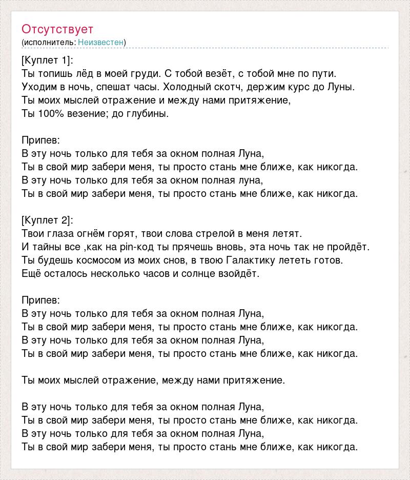 [Куплет 1]: Ты топишь лёд в моей груди. С тобой везёт, с тобой мне по пути. Уходим в ночь, спешат часы. Холодный скотч, держим курс до Луны. Ты моих мыслей отражение и между нами притяжение, Ты 100% везение; до глубины. Припев: В эту ночь только для тебя за окном полная Луна, Ты в свой мир забери меня, ты просто стань мне ближе, как никогда. В эту ночь только для тебя за окном полная луна, Ты в свой мир забери меня, ты просто стань мне ближе, как никогда. [Куплет 2]: Твои глаза огнём горят, твои слова стрелой в меня летят. И тайны все ,как на pin-код ты прячешь вновь, эта ночь так не пройдёт. Ты будешь космосом из моих снов, в твою Галактику лететь готов. Ещё осталось несколько часов и солнце взойдёт. Припев: В эту ночь только для тебя за окном полная Луна, Ты в свой мир забери меня, ты просто стань мне ближе, как никогда. В эту ночь только для тебя за окном полная Луна, Ты в свой мир забери меня, ты просто стань мне ближе, как никогда. Ты моих мыслей отражение, между нами притяжение. В эту ночь только для тебя за окном полная Луна, Ты в свой мир забери меня, ты просто стань мне ближе, как никогда. В эту ночь только для тебя за окном полная Луна, Ты в свой мир забери меня, ты просто стань мне ближе, как никогда.