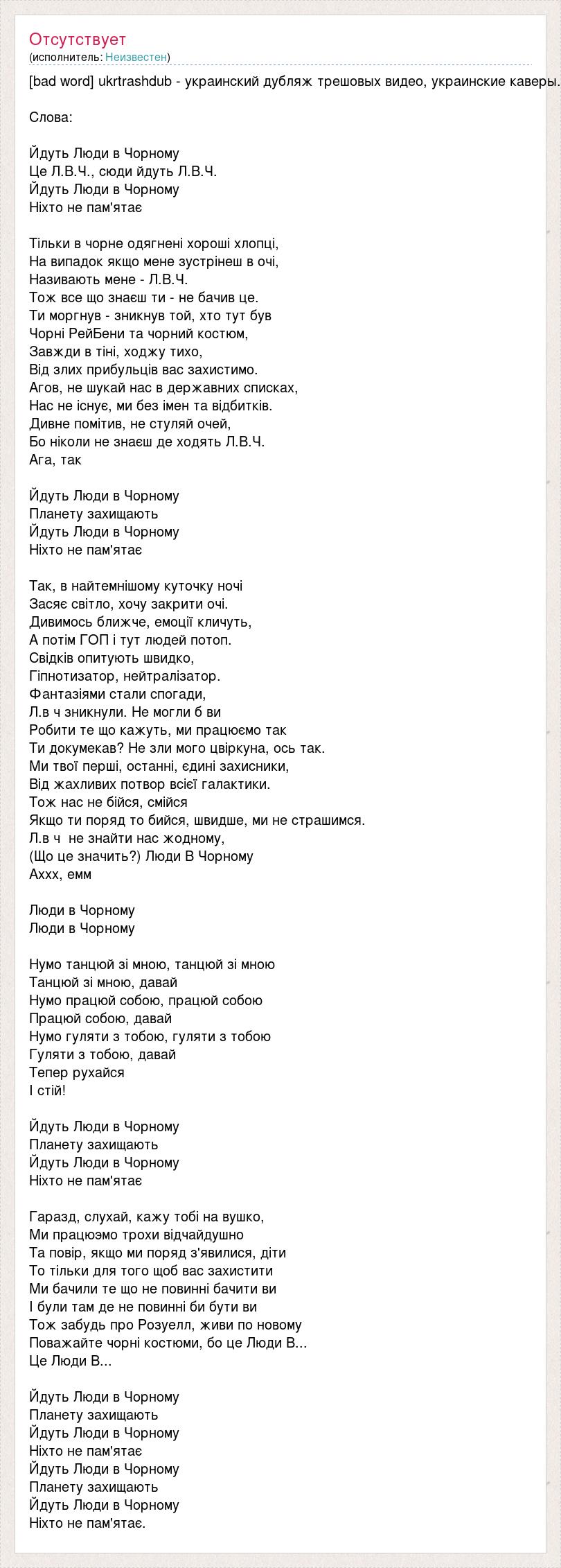 [bad word] ukrtrashdub - украинский дубляж трешовых видео, украинские каверы. Cлова: Йдуть Люди в Чорному Це Л.В.Ч., сюди йдуть Л.В.Ч. Йдуть Люди в Чорному Ніхто не пам'ятає Тільки в чорне одягнені хороші хлопці, На випадок якщо мене зустрінеш в очі, Називають мене - Л.В.Ч. Тож все що знаєш ти - не бачив це. Ти моргнув - зникнув той, хто тут був Чорні РейБени та чорний костюм, Завжди в тіні, ходжу тихо, Від злих прибульців вас захистимо. Агов, не шукай нас в державних списках, Нас не існує, ми без імен та відбитків. Дивне помітив, не стуляй очей, Бо ніколи не знаєш де ходять Л.В.Ч. Ага, так Йдуть Люди в Чорному Планету захищають Йдуть Люди в Чорному Ніхто не пам'ятає Так, в найтемнішому куточку ночі Засяє світло, хочу закрити очі. Дивимось ближче, емоції кличуть, А потім ГОП і тут людей потоп. Свідків опитують швидко, Гіпнотизатор, нейтралізатор. Фантазіями стали спогади, Л.в ч зникнули. Не могли б ви Робити те що кажуть, ми працюємо так Ти докумекав? Не зли мого цвіркуна, ось так. Ми твої перші, останні, єдині захисники, Від жахливих потвор всієї галактики. Тож нас не бійся, смійся Якщо ти поряд то бийся, швидше, ми не страшимся. Л.в ч не знайти нас жодному, (Що це значить?) Люди В Чорному Аххх, емм Люди в Чорному Люди в Чорному Нумо танцюй зі мною, танцюй зі мною Танцюй зі мною, давай Нумо працюй собою, працюй собою Працюй собою, давай Нумо гуляти з тобою, гуляти з тобою Гуляти з тобою, давай Тепер рухайся І стій! Йдуть Люди в Чорному Планету захищають Йдуть Люди в Чорному Ніхто не пам'ятає Гаразд, слухай, кажу тобі на вушко, Ми працюэмо трохи відчайдушно Та повір, якщо ми поряд з'явилися, діти То тільки для того щоб вас захистити Ми бачили те що не повинні бачити ви І були там де не повинні би бути ви Тож забудь про Розуелл, живи по новому Поважайте чорні костюми, бо це Люди В... Це Люди В... Йдуть Люди в Чорному Планету захищають Йдуть Люди в Чорному Ніхто не пам'ятає Йдуть Люди в Чорному Планету захищають Йдуть Люди в Чорному Ніхто не пам'ятає.